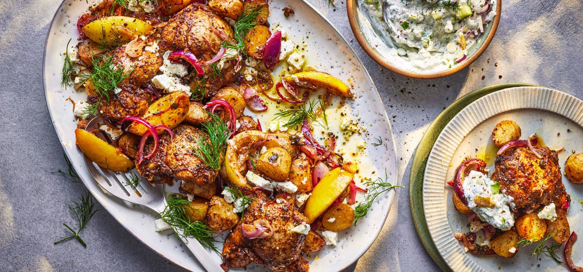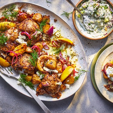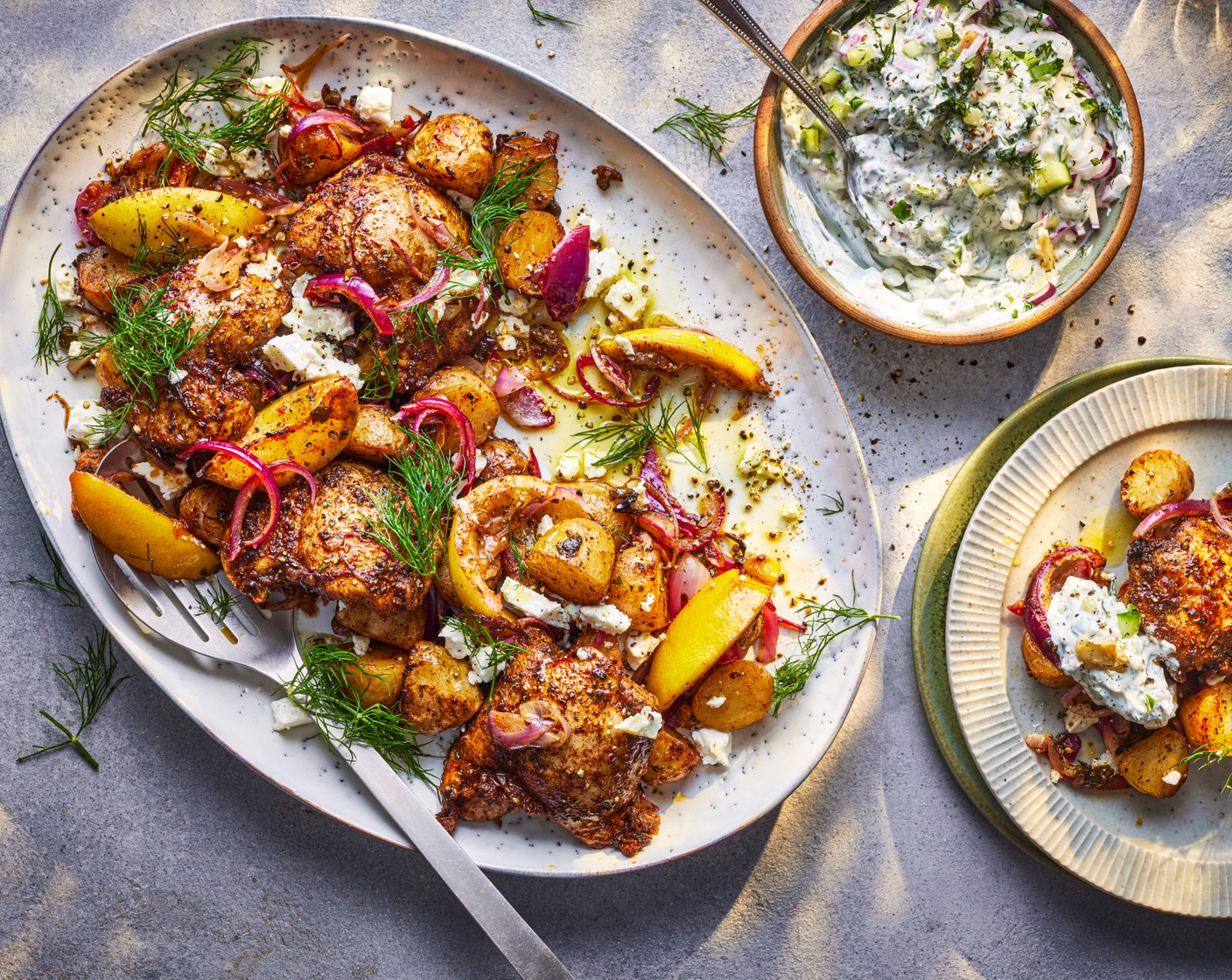 Bursting with the sun-drenched flavours of Greece, Emily English’s one-pan chicken recipe combines seared, shawarma-marinated chicken thighs with fudgy potatoes. It’s served with a super creamy feta-spiked tzatziki.