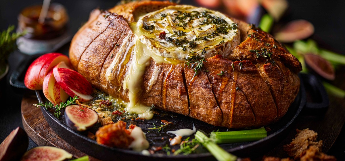 Dunk golden sourdough into gloriously melty, hot-maple-drizzled Camembert baked inside the loaf for maximum gooey goodness. The ultimate tear-and-share starter that’ll have everyone wishing every day was Christmas.