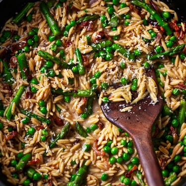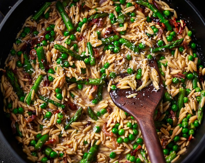 A lighter midweek meal with bright spring flavours, this pancetta, pea and asparagus orzotto comes together in one pot to minimise washing up. Using our chicken stock and the white wine, garlic and herb flavour pot adds rich, effortless depth, while our Collection Calabrian suino nero pancetta, tender asparagus, frozen peas and 24‑month‑aged Parmigiano Reggiano create a fuss‑free, elegant dinner. With just seven ingredients, it’s a delicious option for evening meals — and makes great leftovers, too.