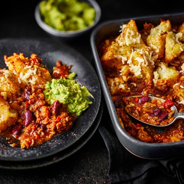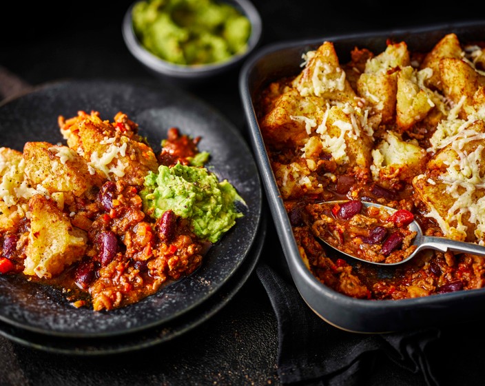 Turn up Friday night with this playful spin on a chilli con carne. It’s topped with crushed hash browns and extra lashings of cheese and served with a generous scoop of guacamole and cooling sour cream to mellow the spice.
