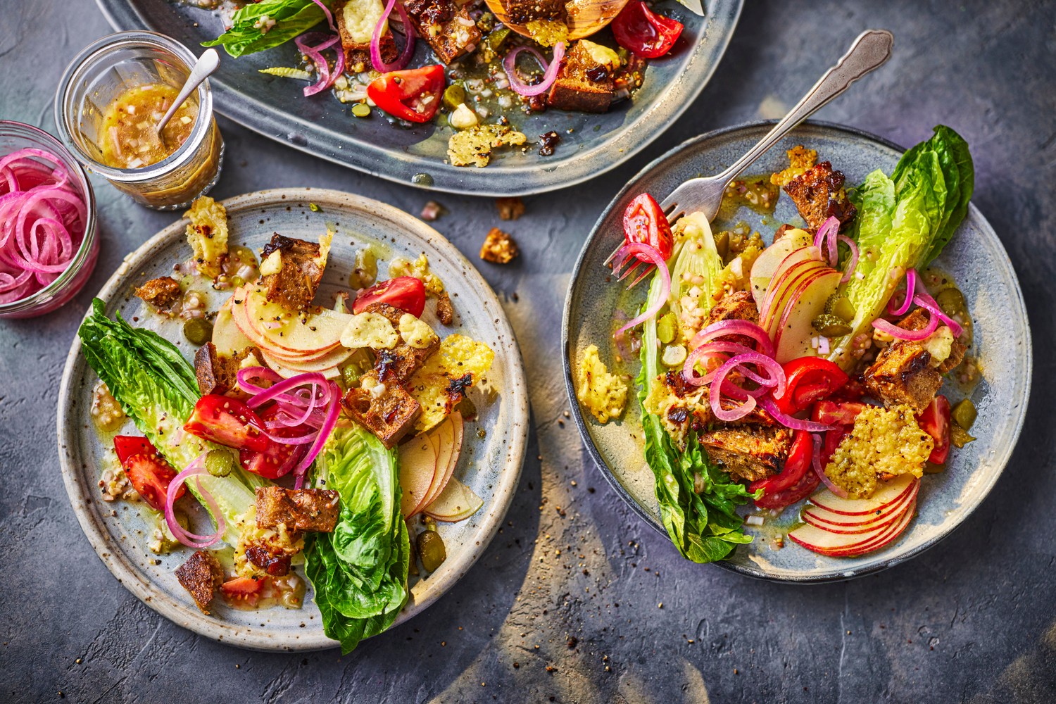 Make our best-in-season Evercrisp Apples the stars of this moreish salad that’s inspired by the classic Ploughman’s lunch. It features crisp gem lettuce, a honey and mustard dressing and cornichons, all finished with some out of this world melted cheese and chutney sourdough croutons.