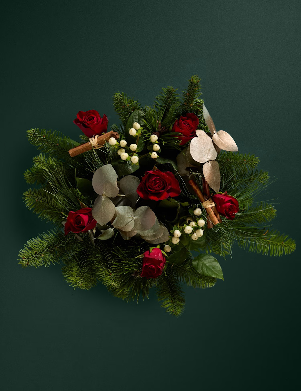 Holly is another classic seasonal plant, either to provide greenery in a wreath or bouquet or as a decorative tree. Roses are also a popular choice for Christmas flowers, choose a bouquet mixed with seasonal foliage such as eucalyptus or laurel to dial up the festive feel.