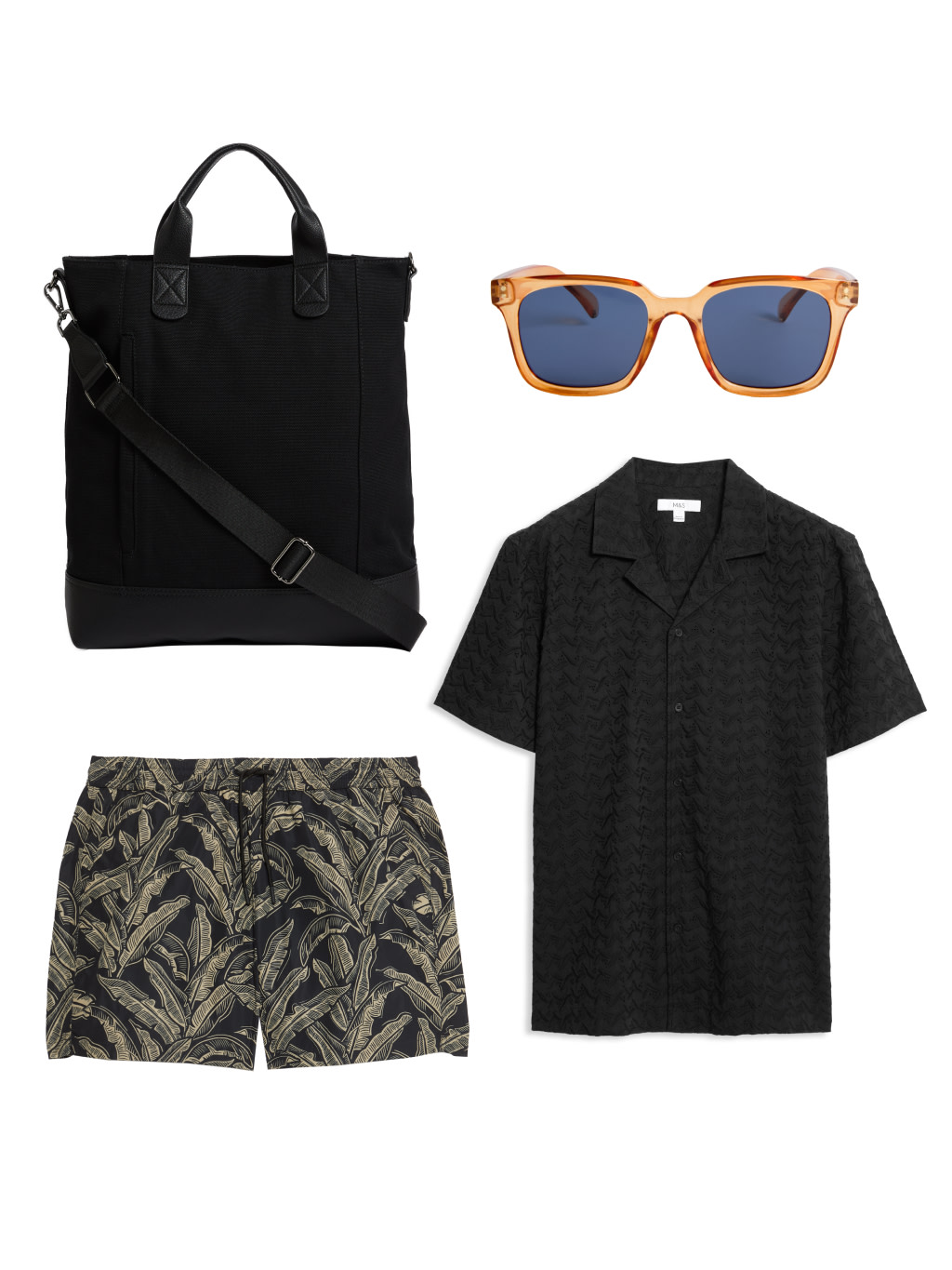 From top left: Bag* £35 (T095449), sunglasses £18 (T096606), embroidered shirt £35 (T251284M), swim shorts* £20 (T288116M).