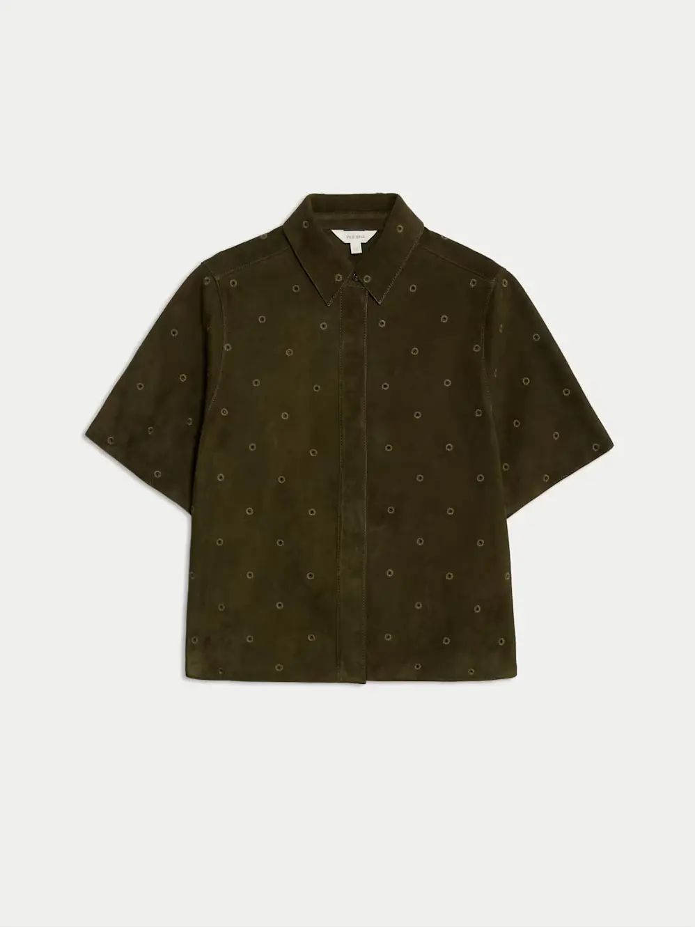 To dial up the texture, look to a delicate lace top. The intricate fabric will complement the buttery texture of your leather skirt and add (even more) interest to your outfit. If you're feeling bold, reach for a coordinating shirt for a statement-making finish.
