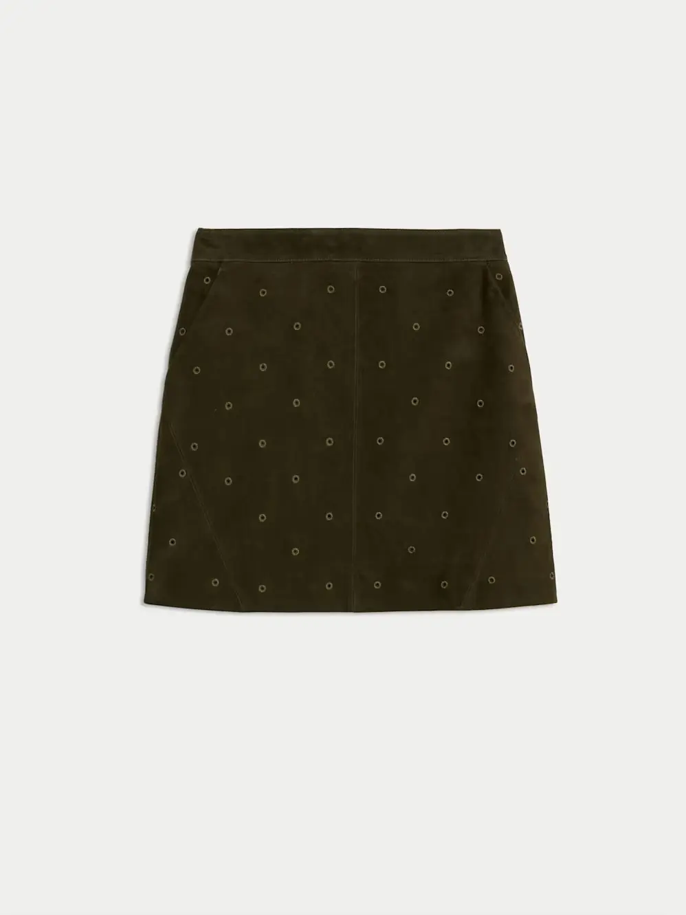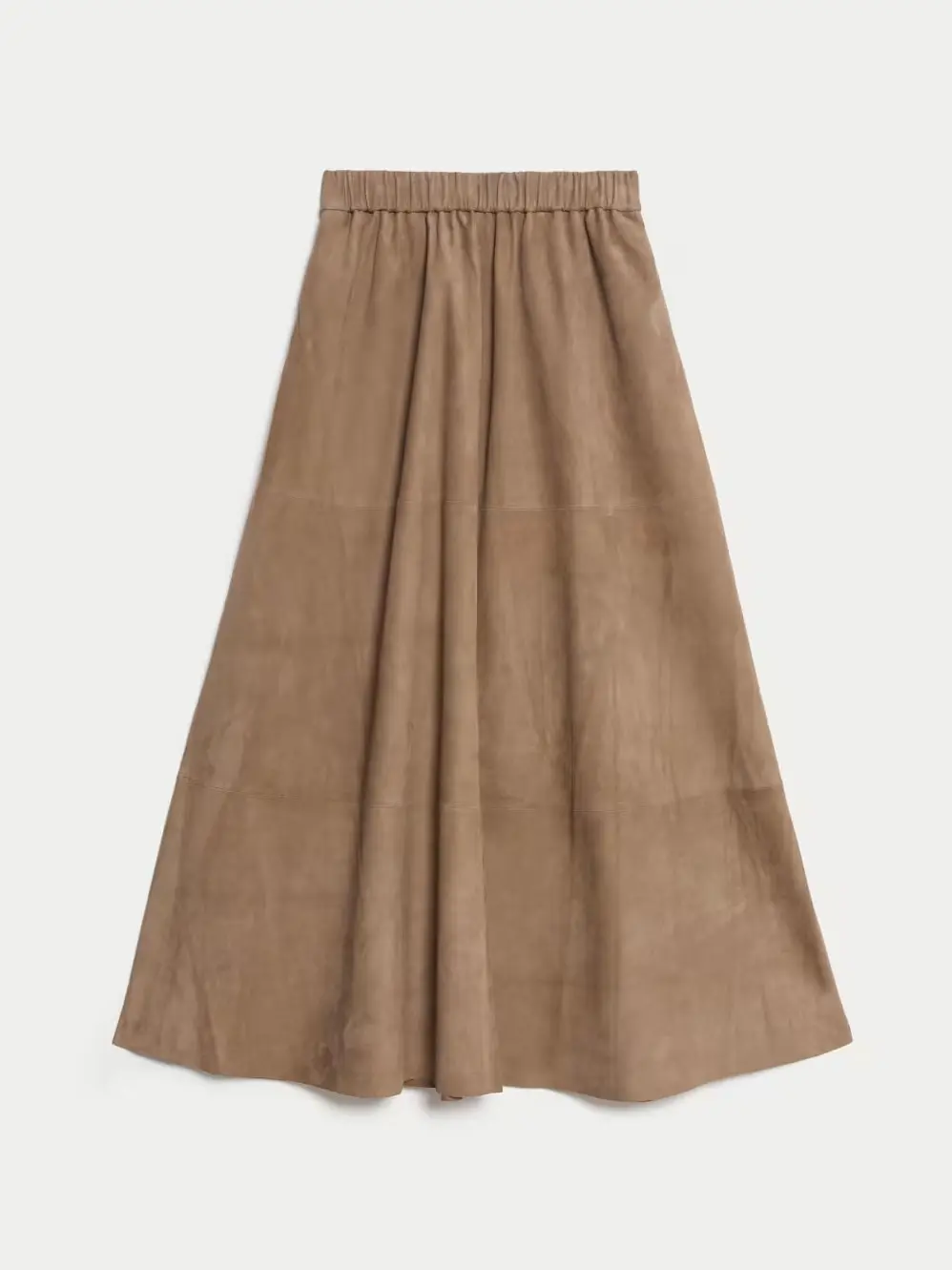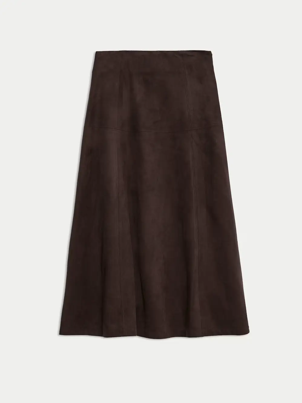 If you're looking to bring richness to your wardrobe, a brown leather skirt is a chic option. It brings welcome depth and pairs well with pretty much any colour. We love this brown suede skirt from Autograph that has a subtle A-line silhouette. Try pairing it with a frilled blouse and knee-high boots for a smart office-ready look.
