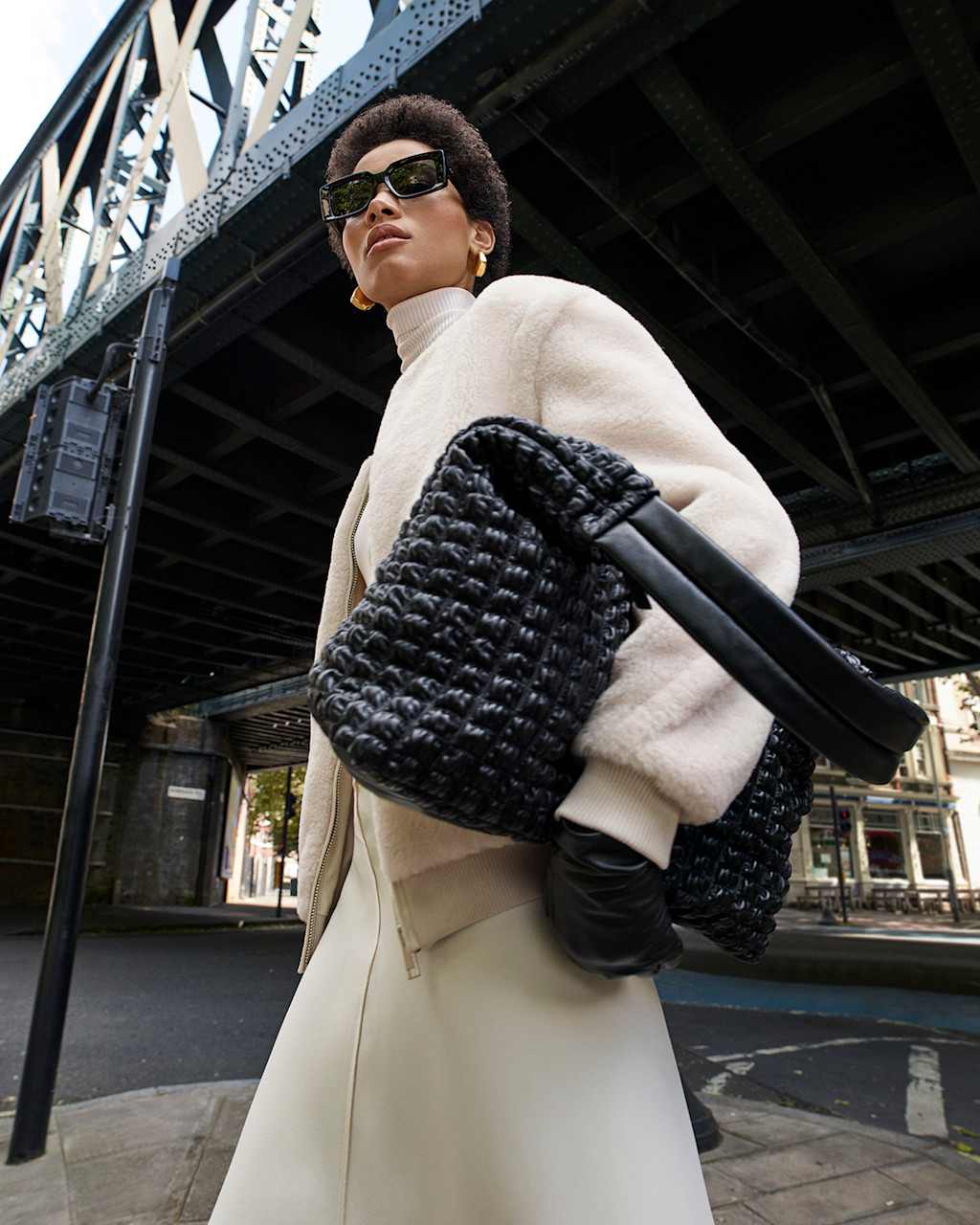 Try drenching colour head to toe to make an impact. Hero each piece by varying the textures; try soft, tactile knitwear teamed with high-shine leather or suede. Keep accessories tonal but interesting too, the eyelet detailing on these flat pumps effortlessly elevates them into the spotlight.