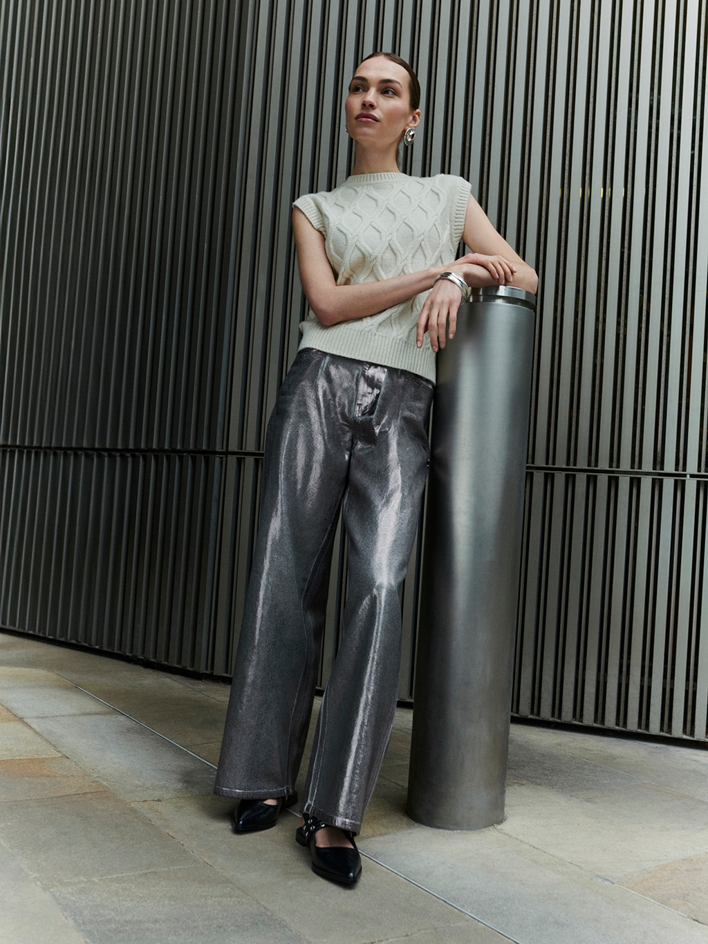 Wear now with a fitted utility-style waistcoat – perfect for balancing out the dramatic palazzo shape – and then once warmer weather arrives, team with a streamlined T-shirt.