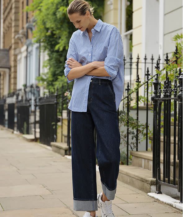 The summer months might be drawing to a close, but that doesn't mean you have to dive straight into boots and knitwear. Discover a fresh, transitional way to wear wide-leg jeans by cuffing the hem and teaming with box-fresh white trainers for a laid-back, retro feel. Keep the proportions in check by half-tucking your boyfriend shirt: this gives your figure a bit of definition, whilst still channelling a relaxed, laid-back vibe.