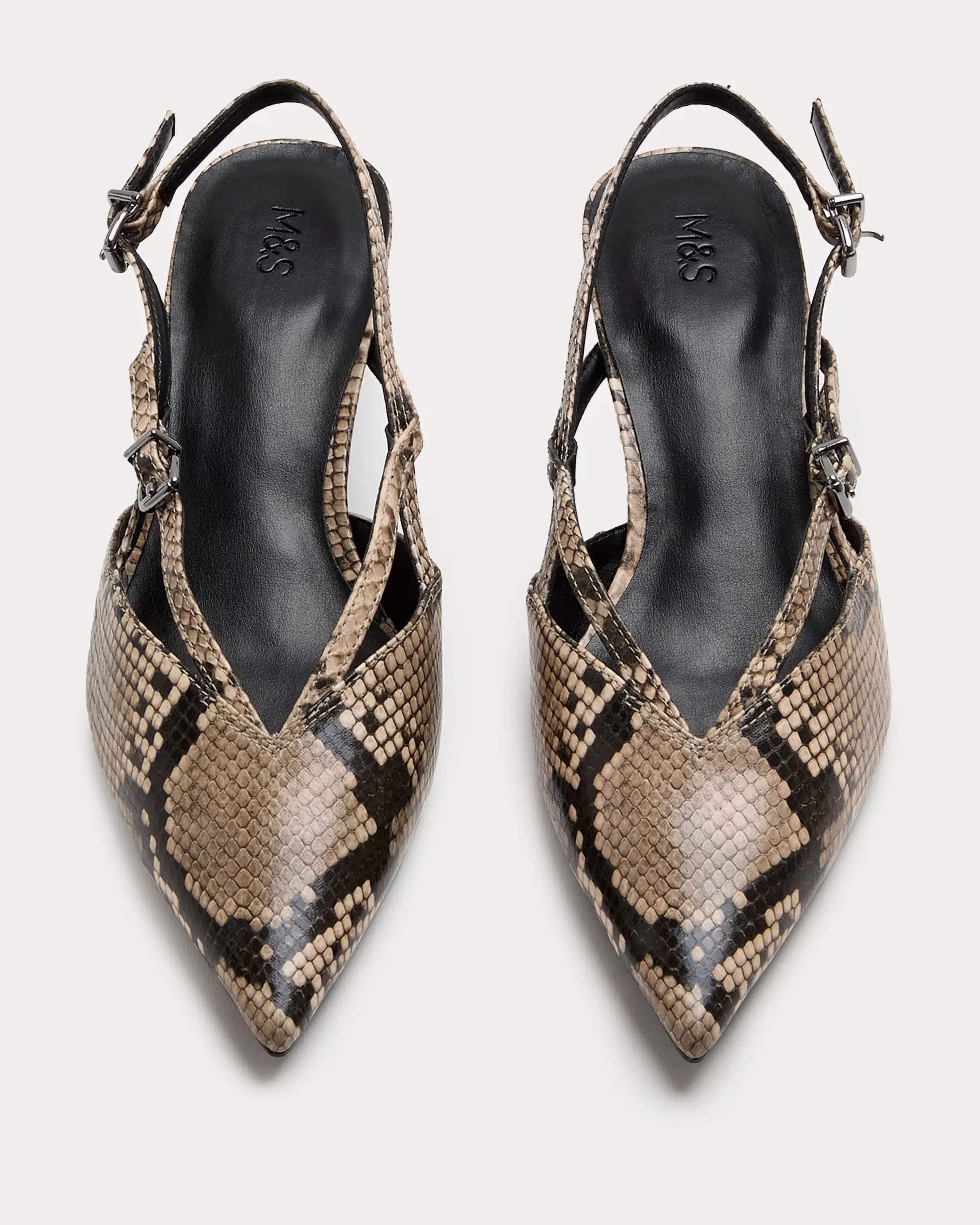 Keep things pared back by teaming with a classic blue or white shirt (look for one that has subtle details to add interest), using it as a blank canvas to showcase a statement necklace or earrings. Style with striking footwear, such as these snake-print kitten heels, to elevate for evening plans.
