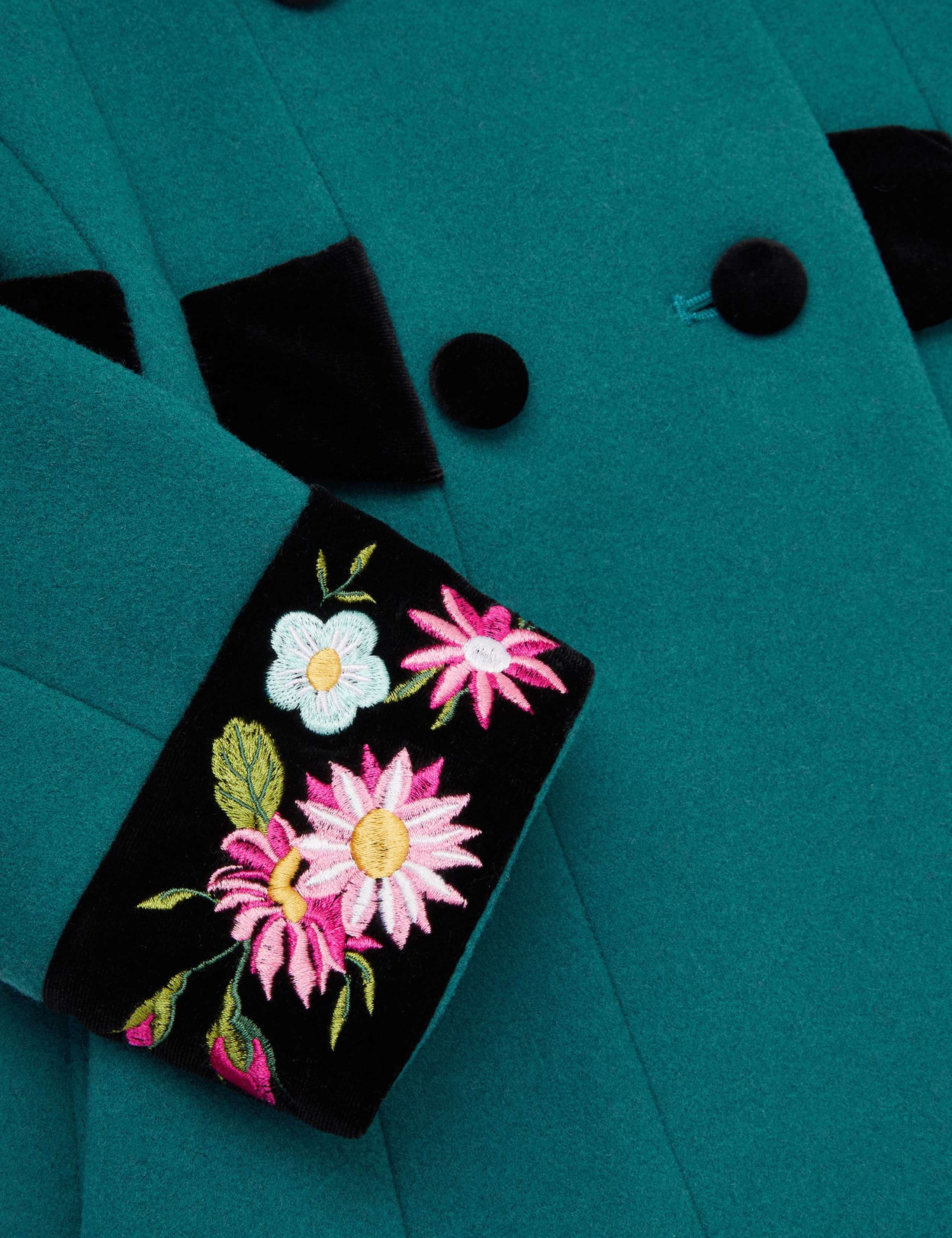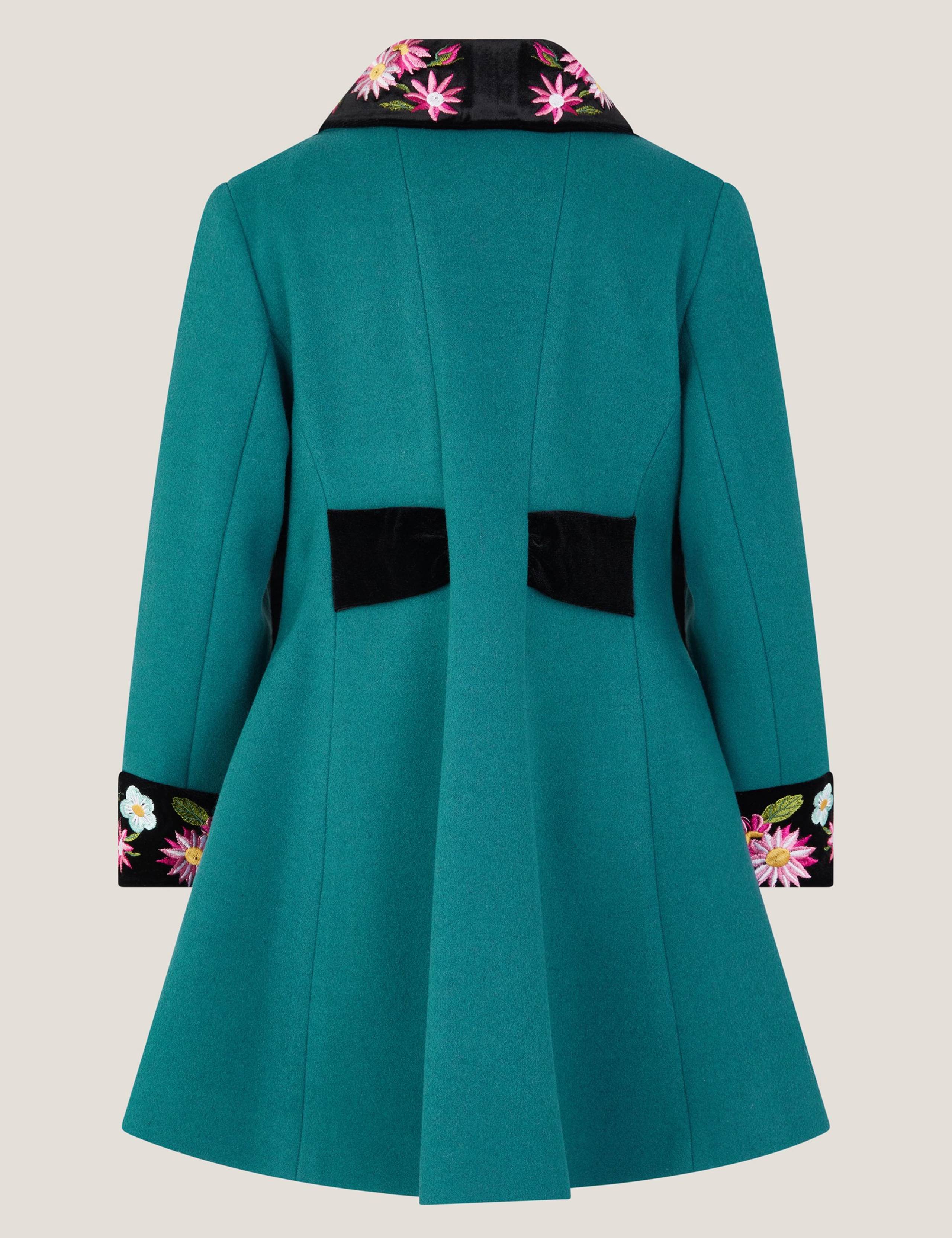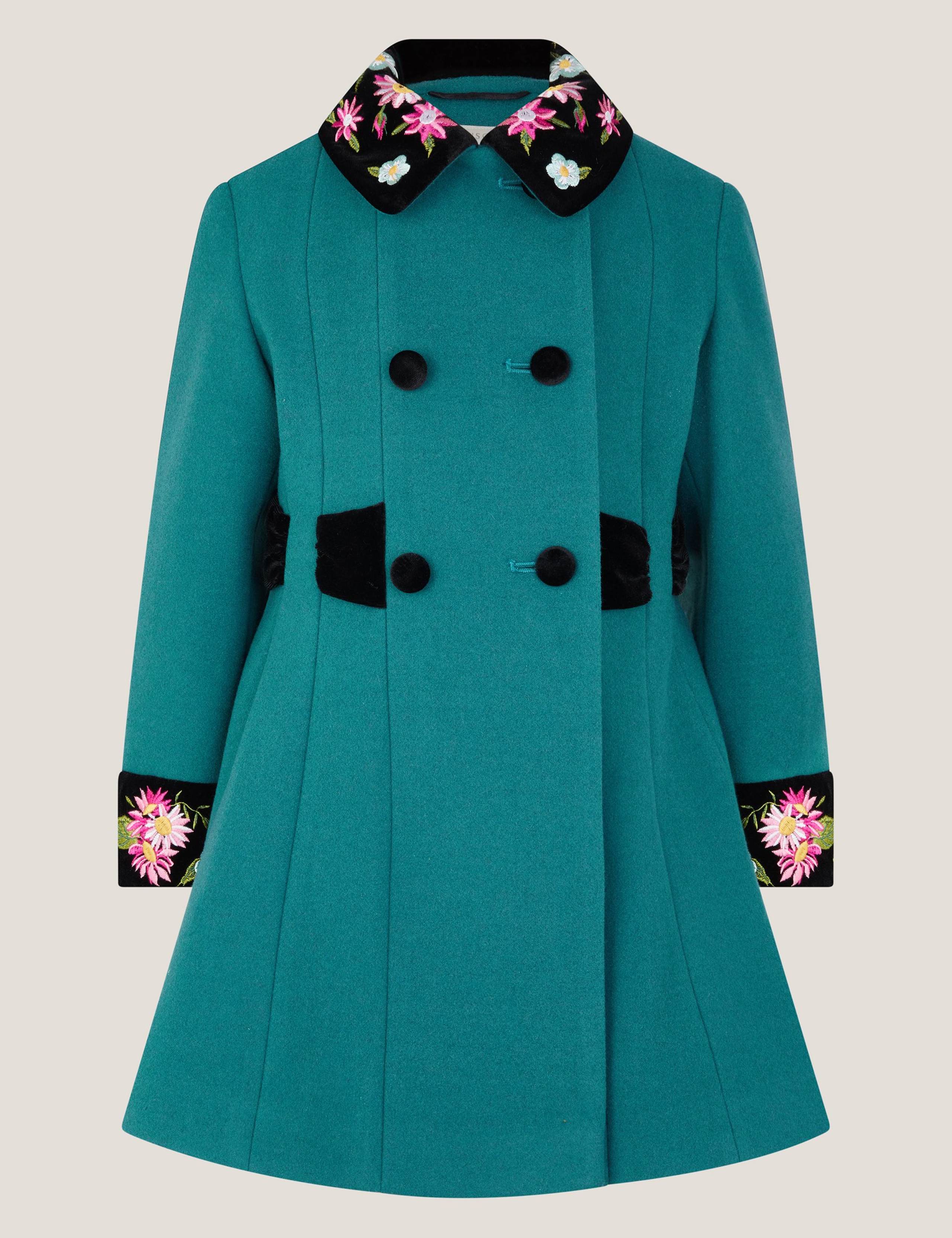 This kids coat from Monsoon is a charming choice. It's designed in a regular fit, with a neat double-breasted button front. A contrast collar and floral embroidery add vintage-inspired touches. This style is lined for comfort.