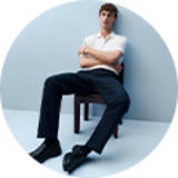 Man wearing grey suit and white polo shirt