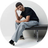 Man wearing printed top and white jeans