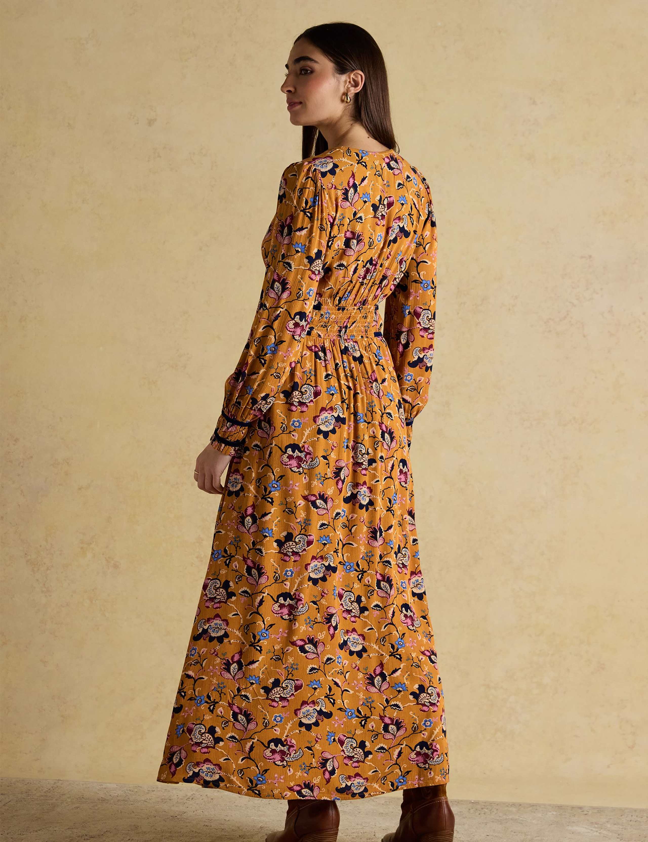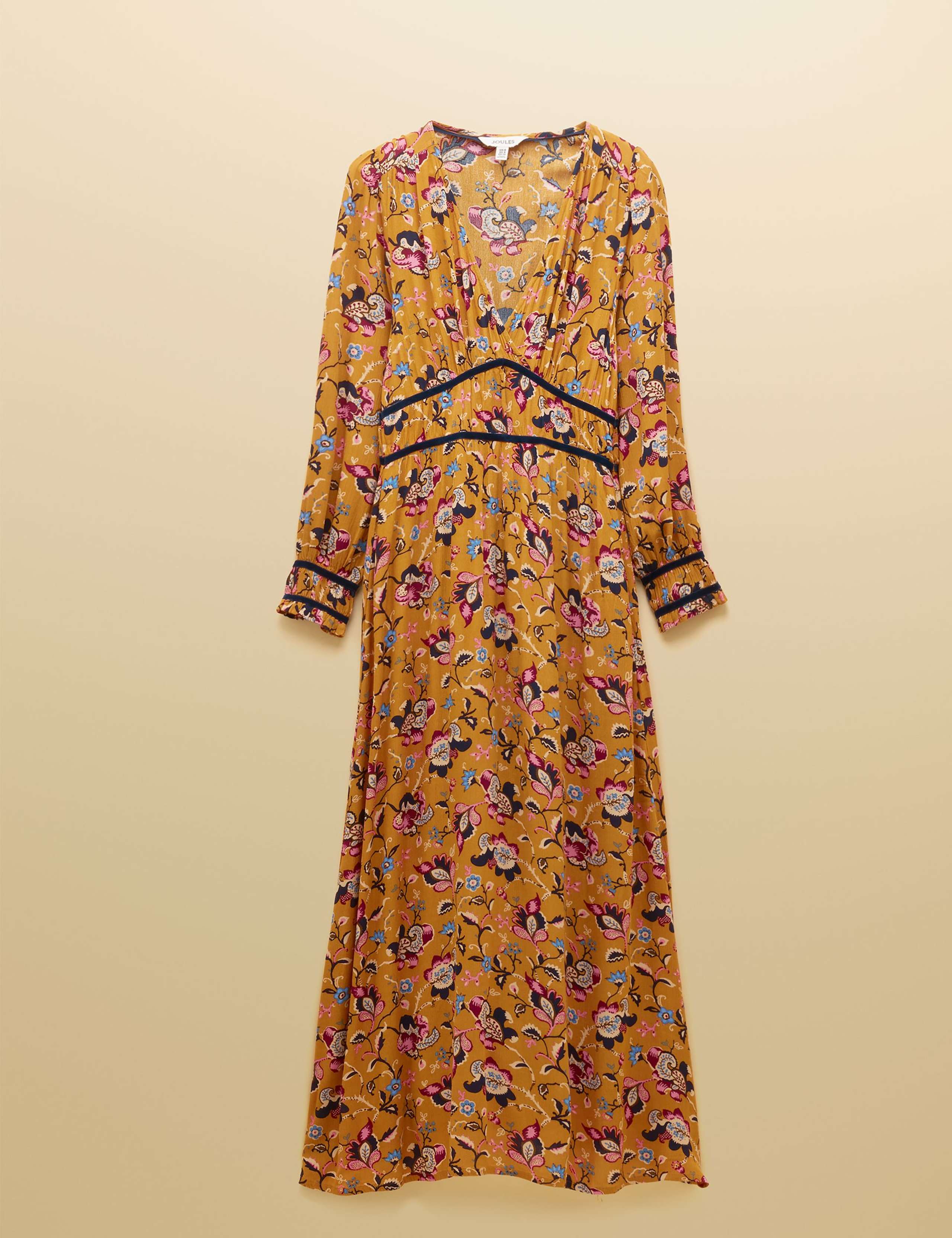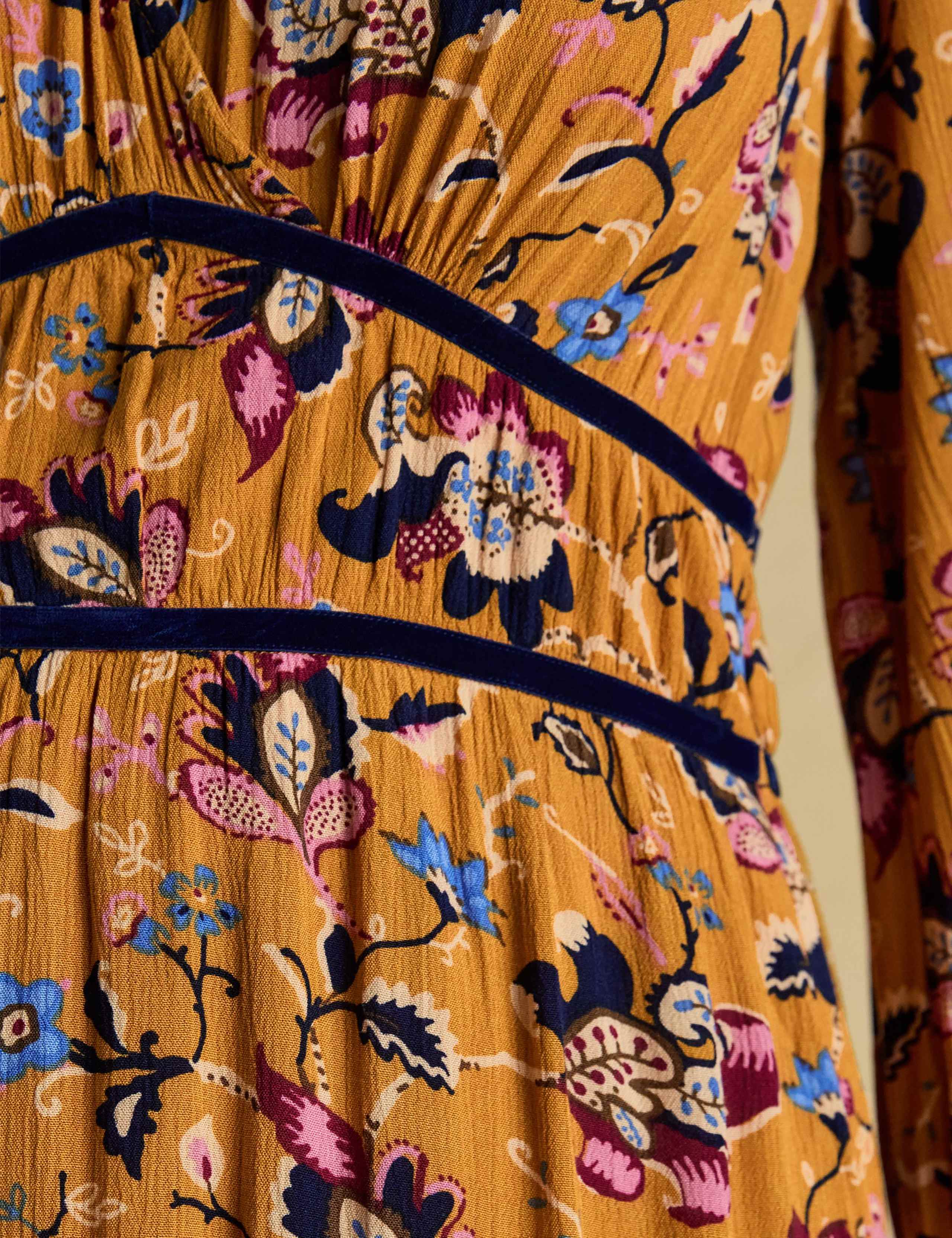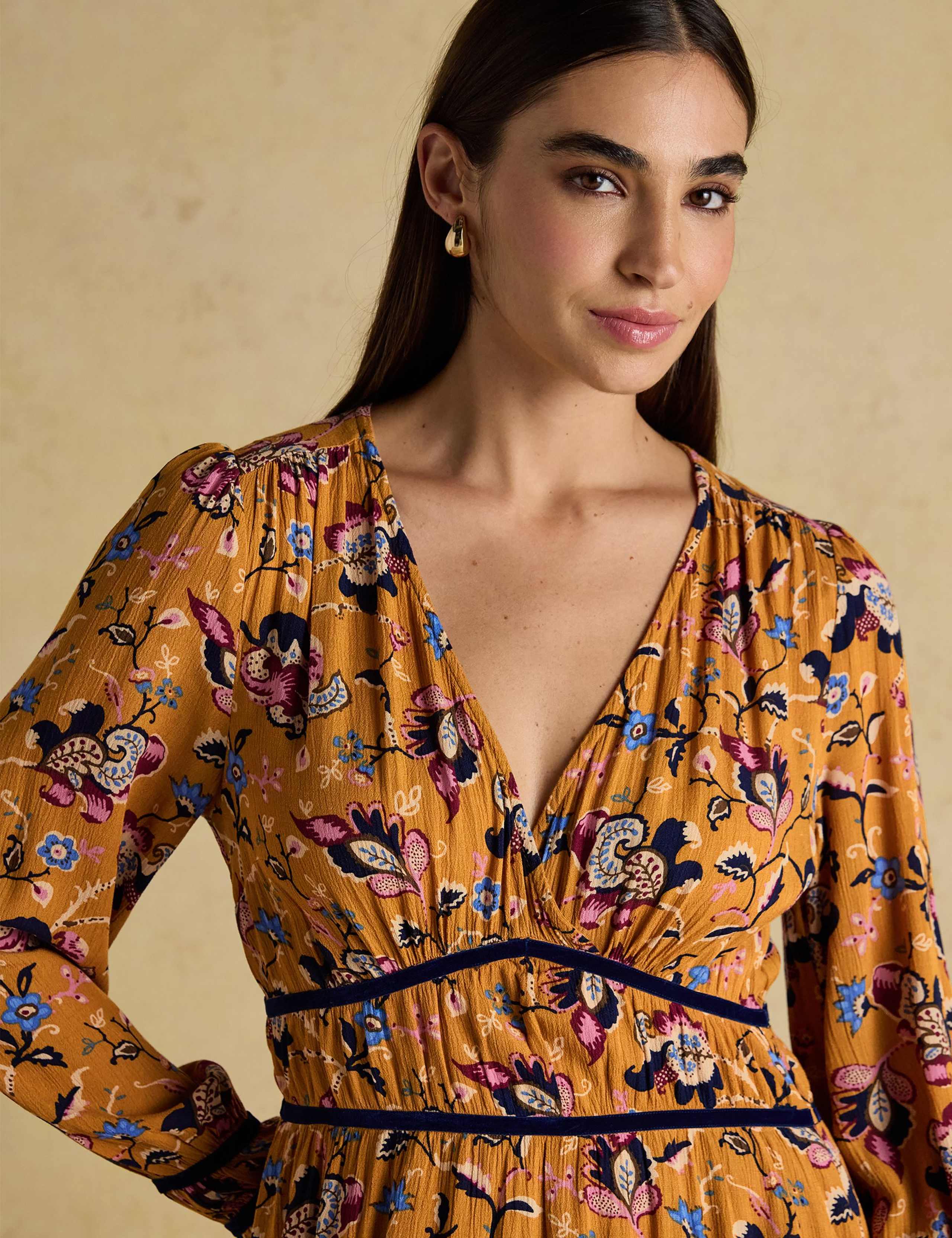 Bring a touch of boho-inspired flair to your wardrobe with this floral-print dress from Joules. The waisted style is cut to a comfy regular fit, with a flattering deep v-neckline and cosy long sleeves. A midaxi-length skirt completes the design. This piece is lined for comfort.