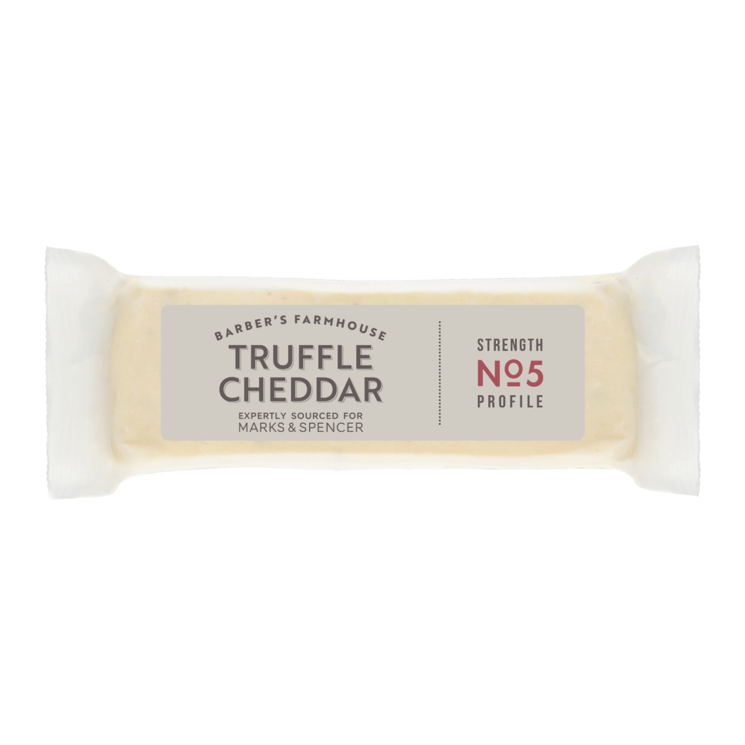 Complete your festive cheeseboard with our Barber's Farmhouse Truffle Cheddar. Expertly sourced for M&S and made with British milk, it's blended with minced black summer truffles for a rich and savoury taste.