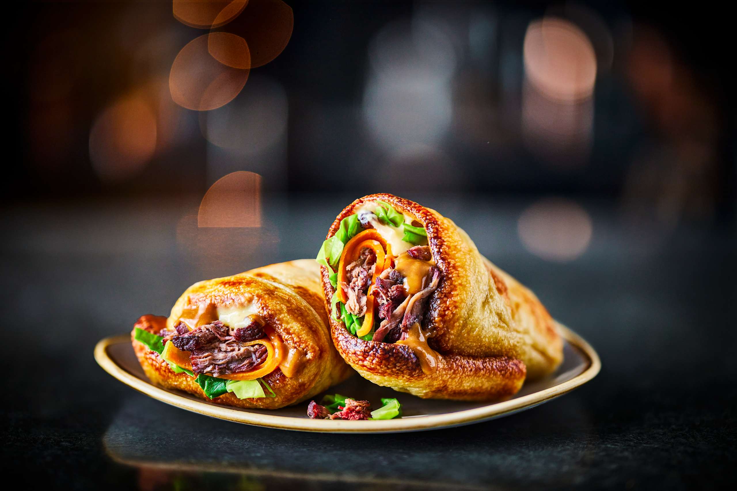 This festive wrap combines slow-cooked British roast beef, tender roast carrots and spring greens with a cheesy beef béchamel sauce. It’s all encased in a giant golden Yorkshire pudding wrap for a full Christmas dinner in every bite.