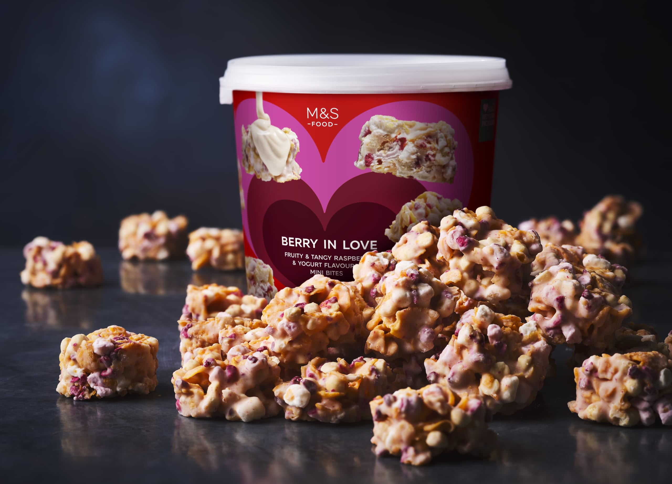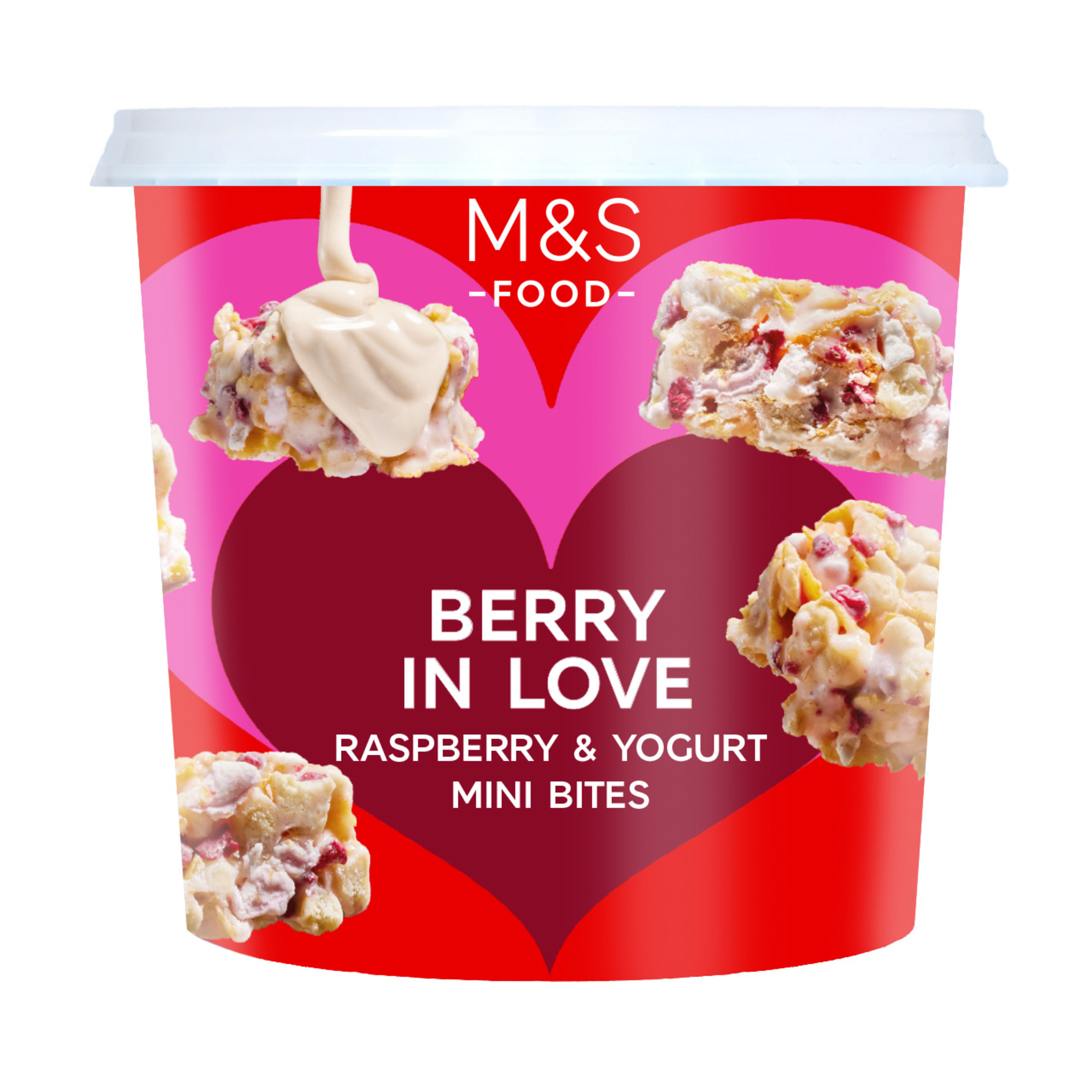 Who can resist falling Berry in Love with these fruity mini bites? Clusters of crunchy cornflakes, biscuit, soft marshmallow and raspberry are wrapped in a yogurt-flavoured coating.