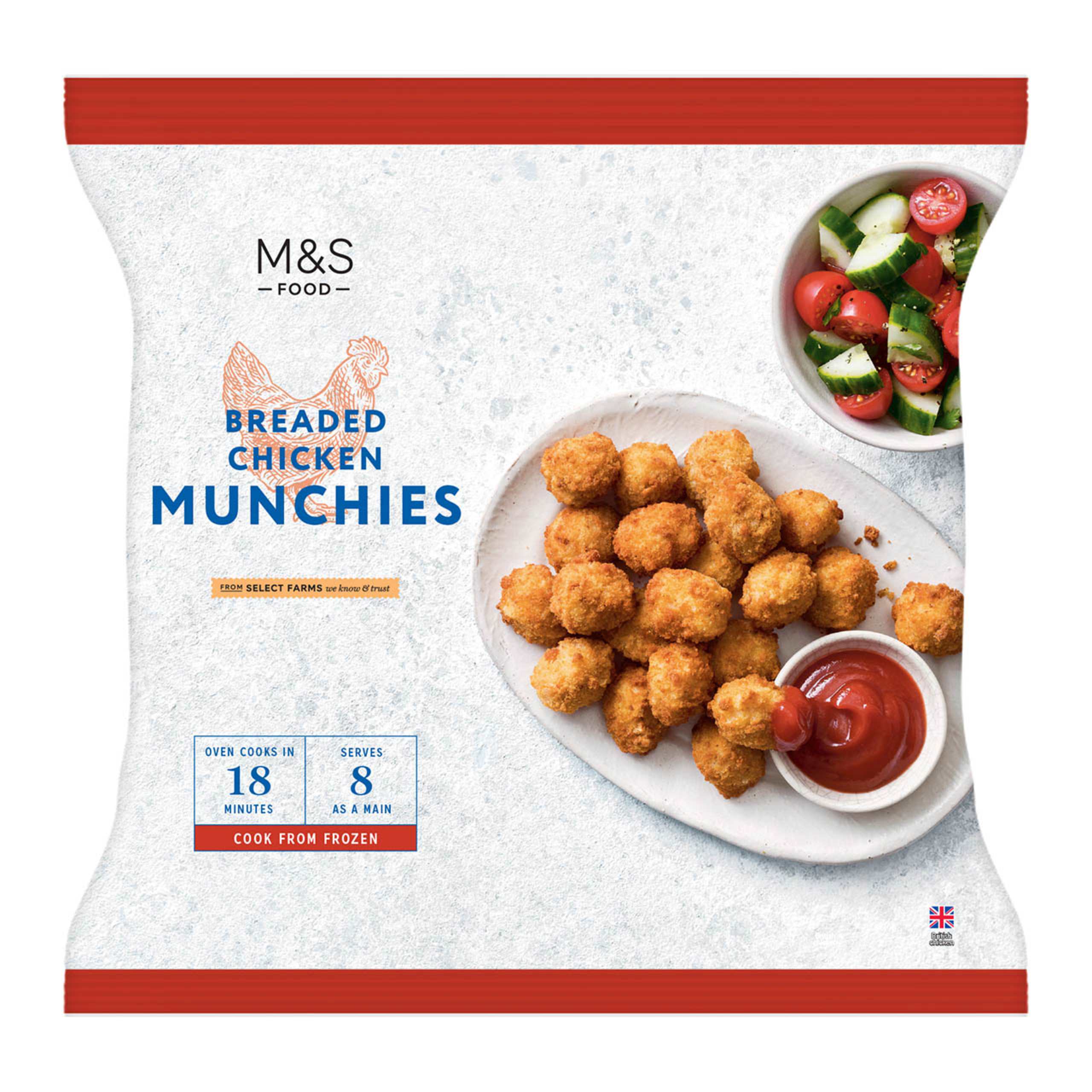 Bite-sized pieces of M&S Select Farms chicken breast are coated in a golden crumb. Simply serve with chips, slaw and your favourite dipping sauce.