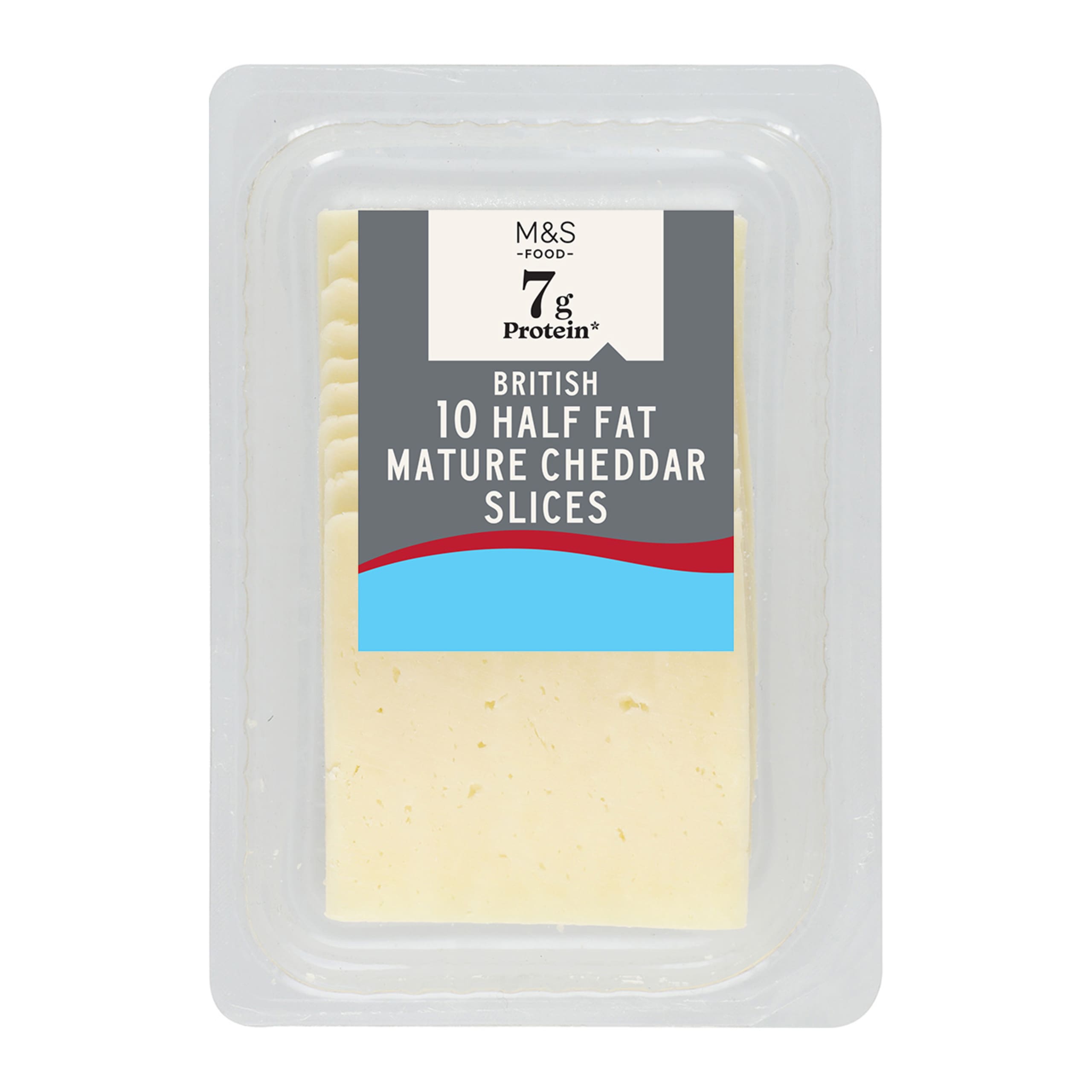 Our British Half Fat Mature Cheddar Slices pack a punch with 7g of protein per slice. Made from high-quality British milk, they have a rich and tangy flavour.