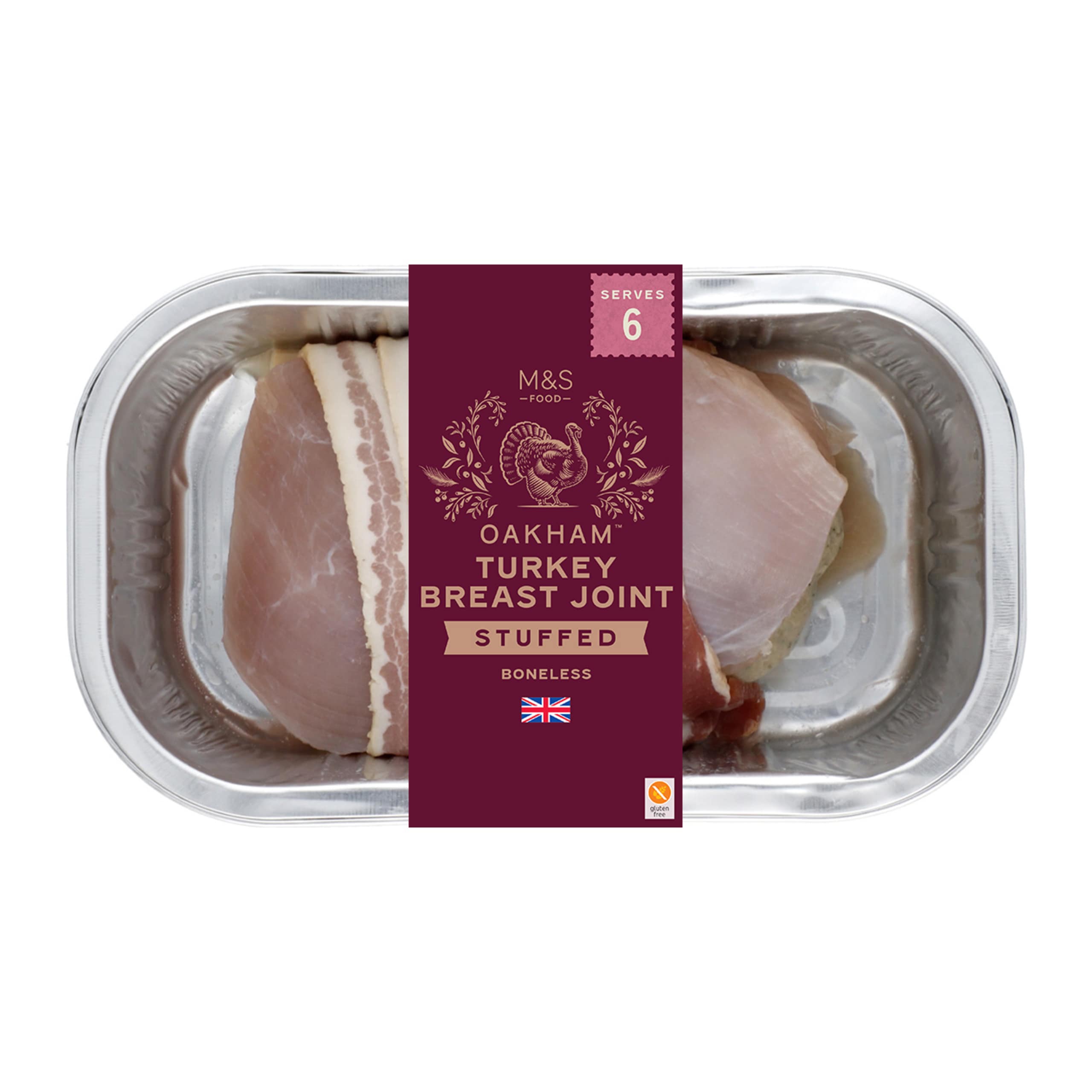 Our British Oakham Stuffed Turkey Breast Joint is sourced from M&S Select Farms we know and trust. This boneless turkey breast is basted in turkey stock and buttermilk, accompanied by flavour-packed pork, sage, and onion stuffing and topped with oak-smoked streaky outdoor-bred bacon.