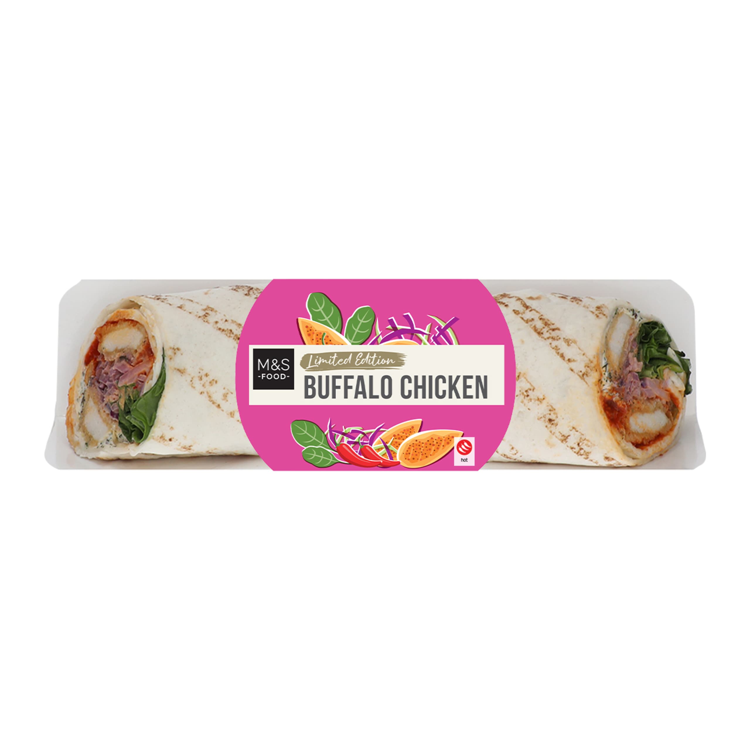 Our Buffalo Chicken wrap is filled with breaded Southern-fried British chicken goujons, spicy coleslaw and spinach in a fluffy tortilla. With a kick of hot chilli sauce and a tangy buttermilk ranch dressing for layers of bold flavour.