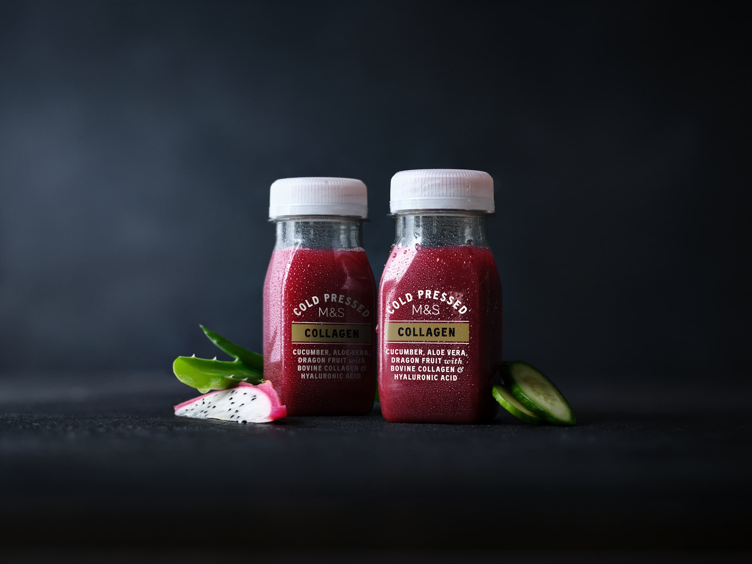 Our Cold Pressed Collagen drink is made with cucumber, aloe vera and dragon fruit, fortified with hyaluronic acid, added vitamins and zinc. Easy to enjoy while out and about, it features our Eat Well flower so you know it's a healthy choice.