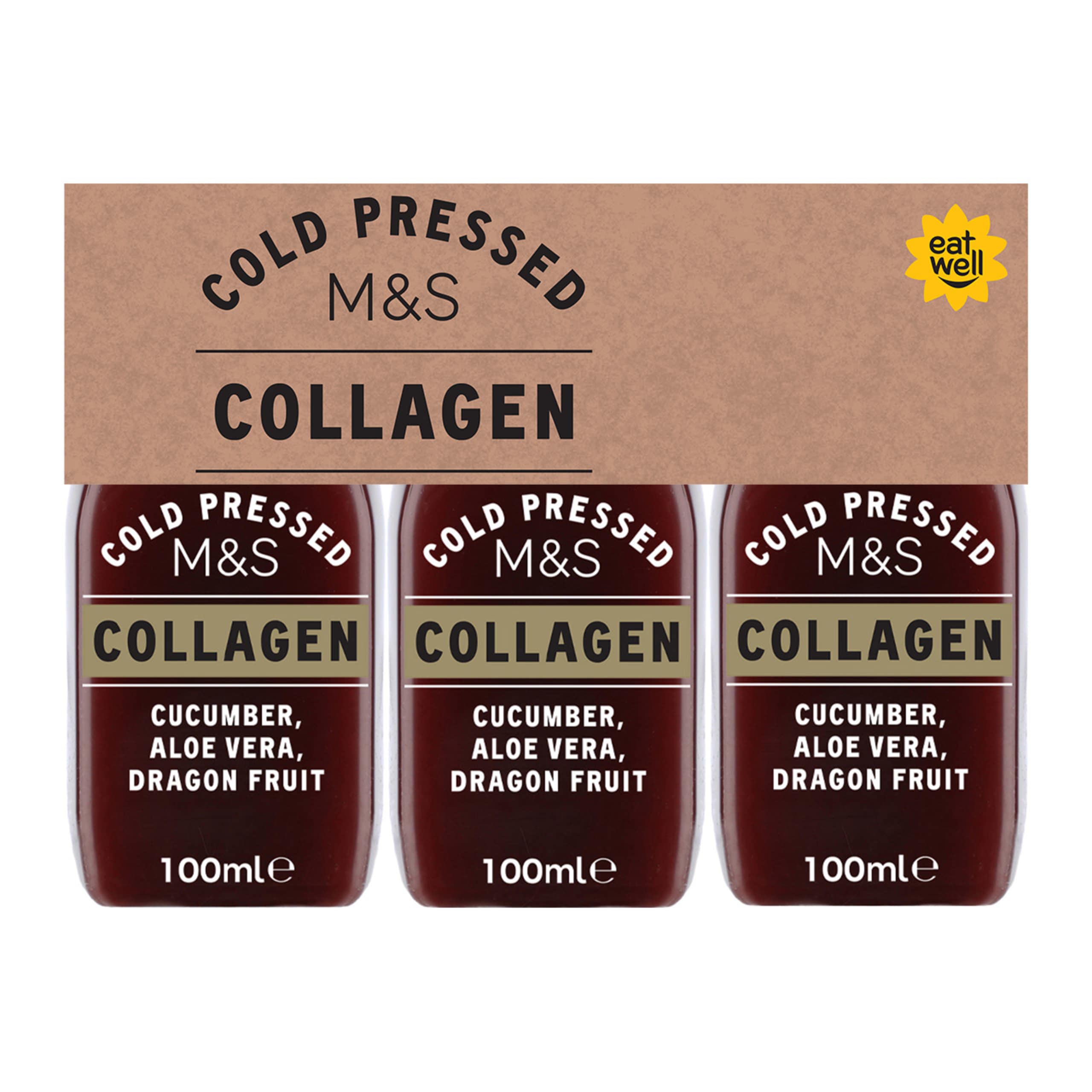Our Cold Pressed Collagen juice blends cucumber, aloe vera, and beetroot juices with dragon fruit, enhanced with collagen peptides and hyaluronic acid. Packaged in handy shot sizes and infused with vitamins and zinc, it features our Eat Well flower so you know it's a healthy choice and can be enjoyed as part of a balanced diet.