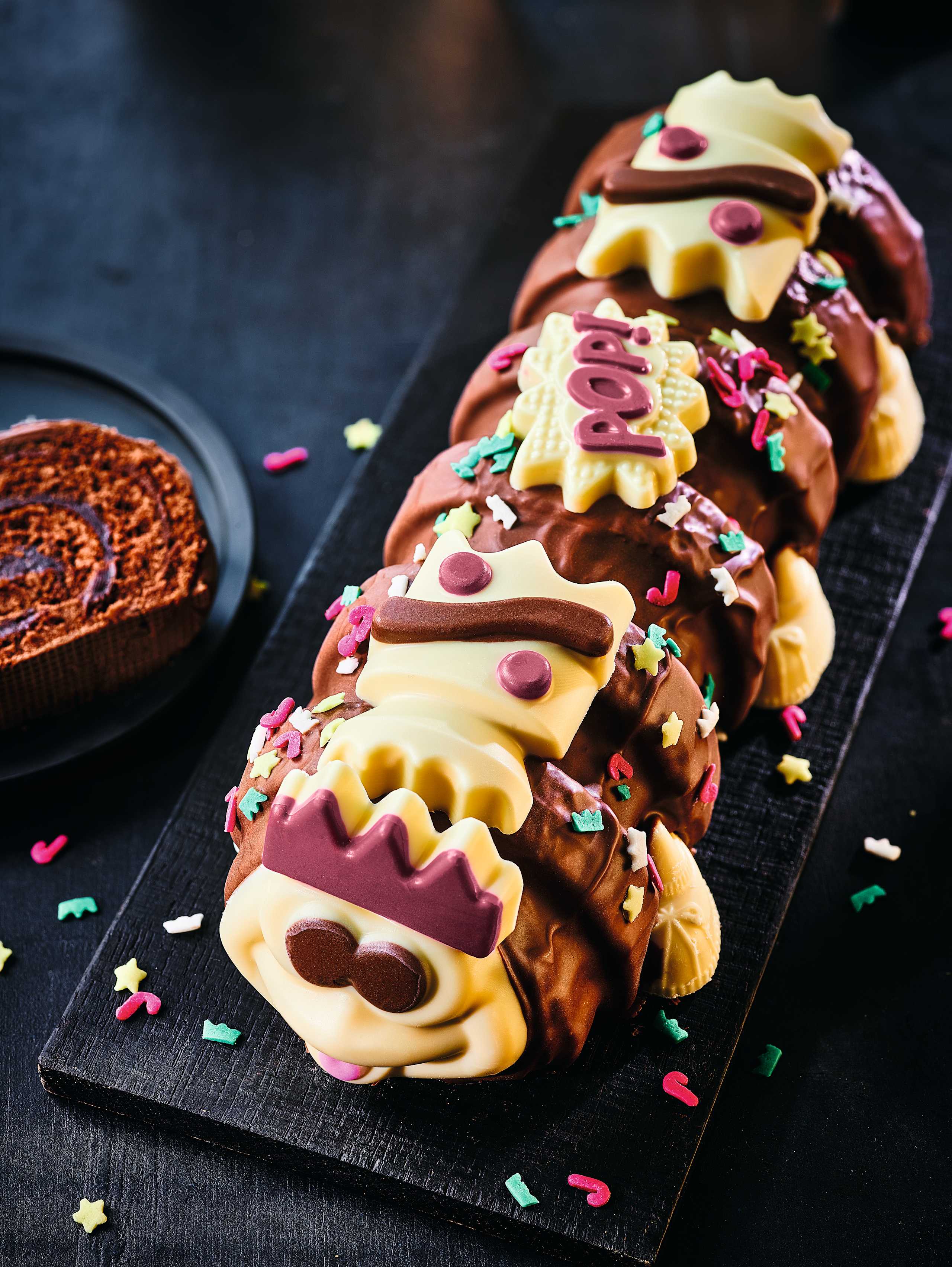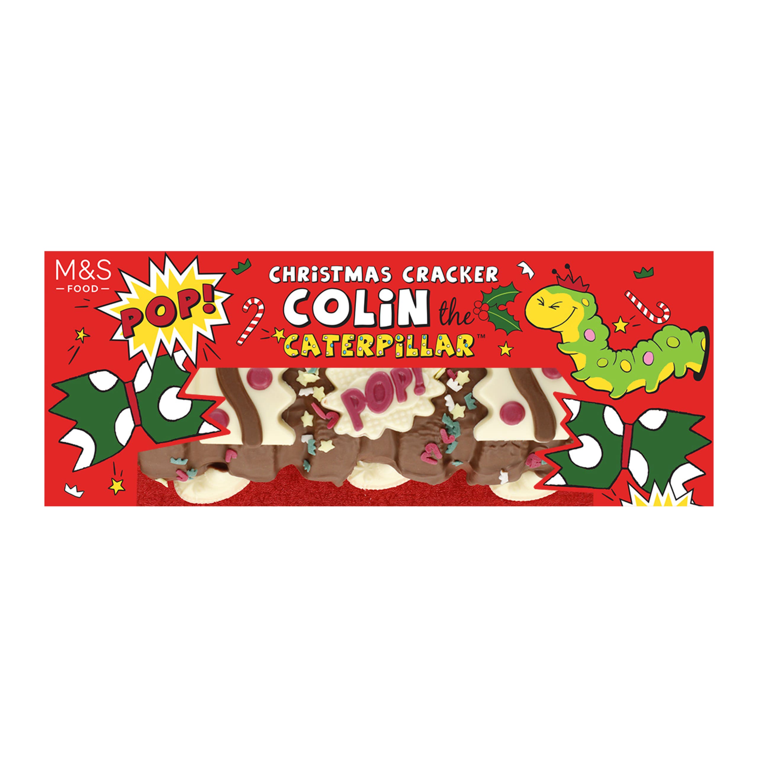 Colin's had a seasonal makeover and is decked out as a Christmas cracker in this limited-edition festive version of our iconic cake. The extremely chocolatey sponge cake is filled with creamy chocolate buttercream and enveloped in smooth milk chocolate. Finished with a decorated chocolate face and a festive, popping candy-filled chocolate cracker plaque, he's guaranteed to spread good cheer.