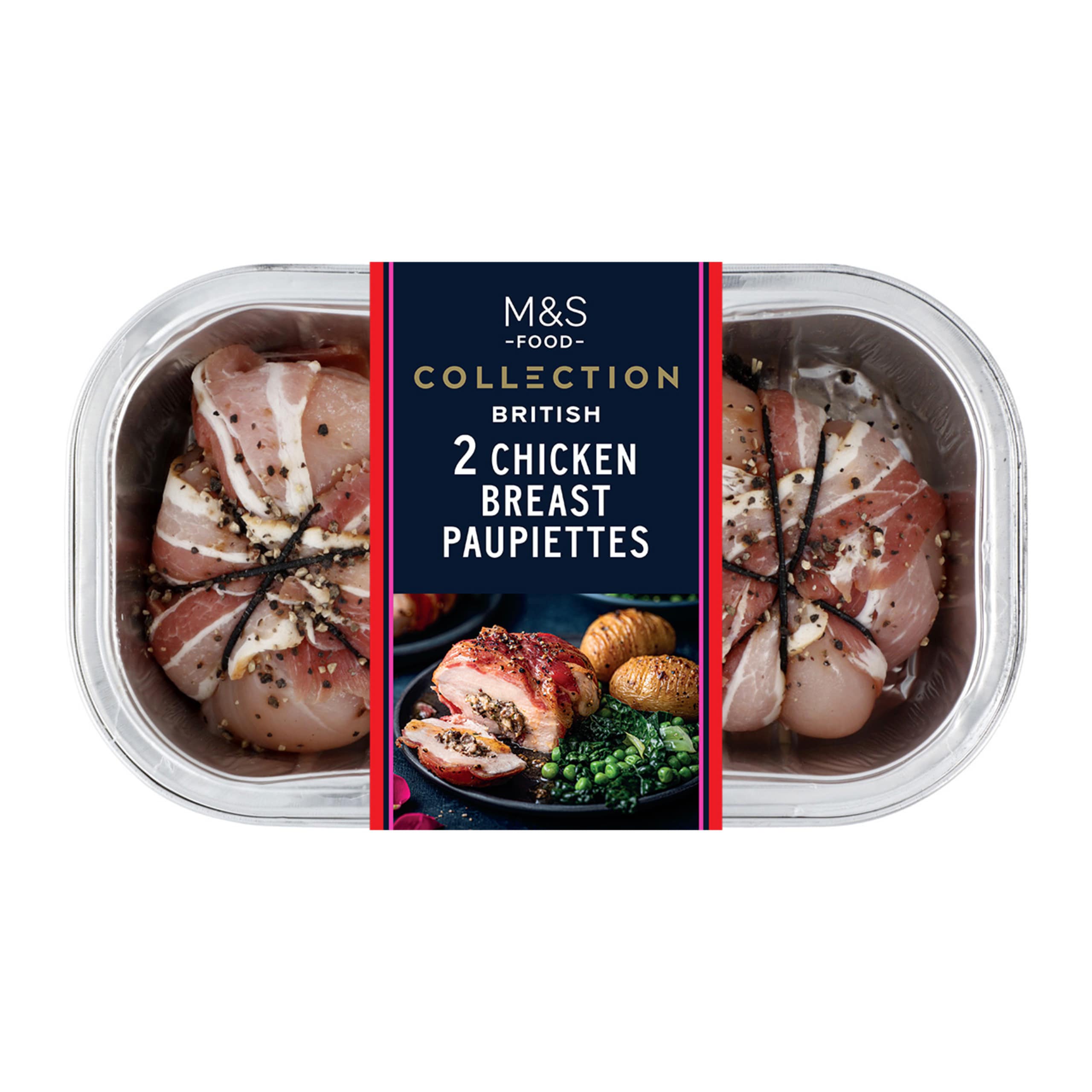 Succulent British chicken breasts from M&S Select Farms, filled with a rich blend of mushrooms in a soft cheese, sherry and black truffle sauce. Each paupiette is carefully wrapped in oak- and applewood-smoked bacon, then finished with butter enriched with chicken stock and black summer truffle.