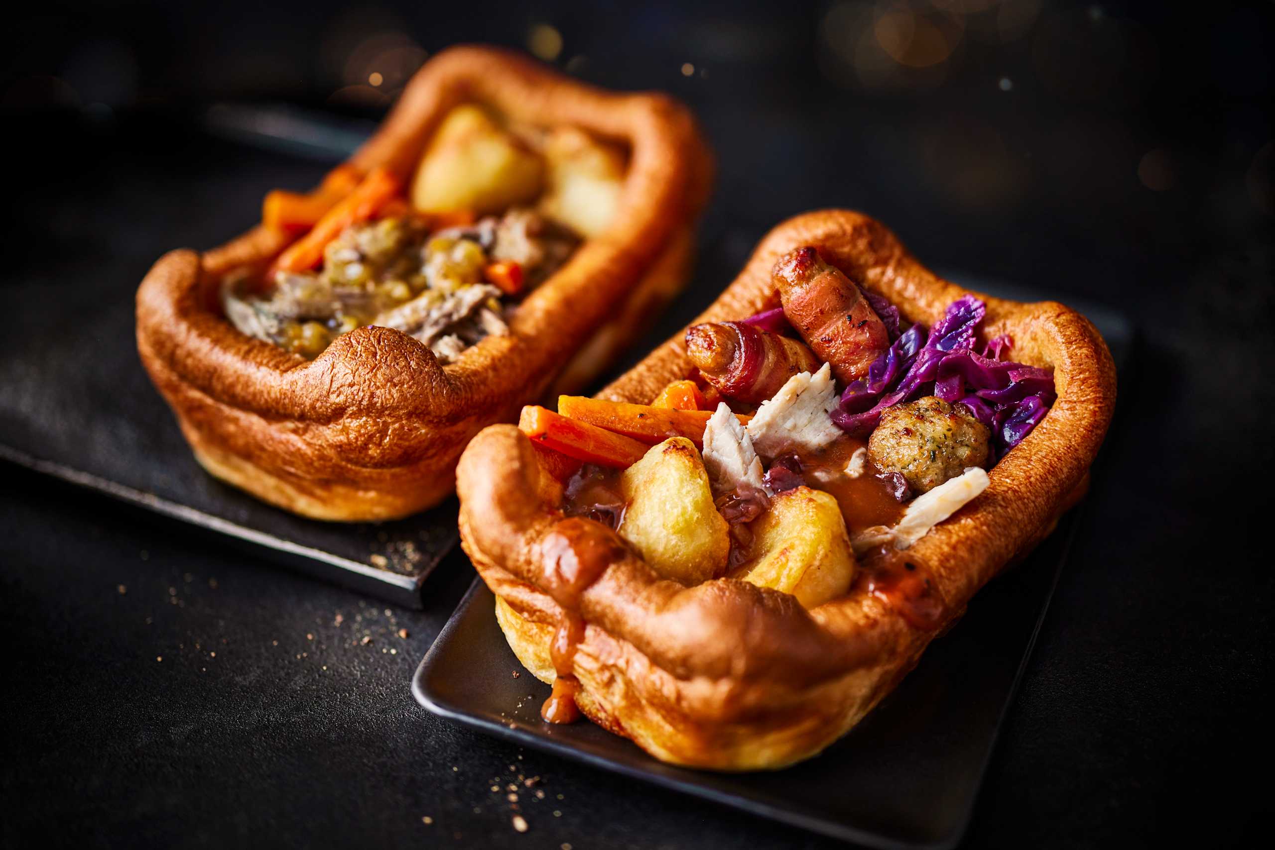 Why wait until the big day to enjoy all your festive faves? This giant golden Yorkshire pudding is piled high with succulent British turkey, outdoor-bred pork stuffing balls, honey-roasted carrots, lightly spiced red cabbage and classic pigs in blankets, served with a rich cranberry gravy.