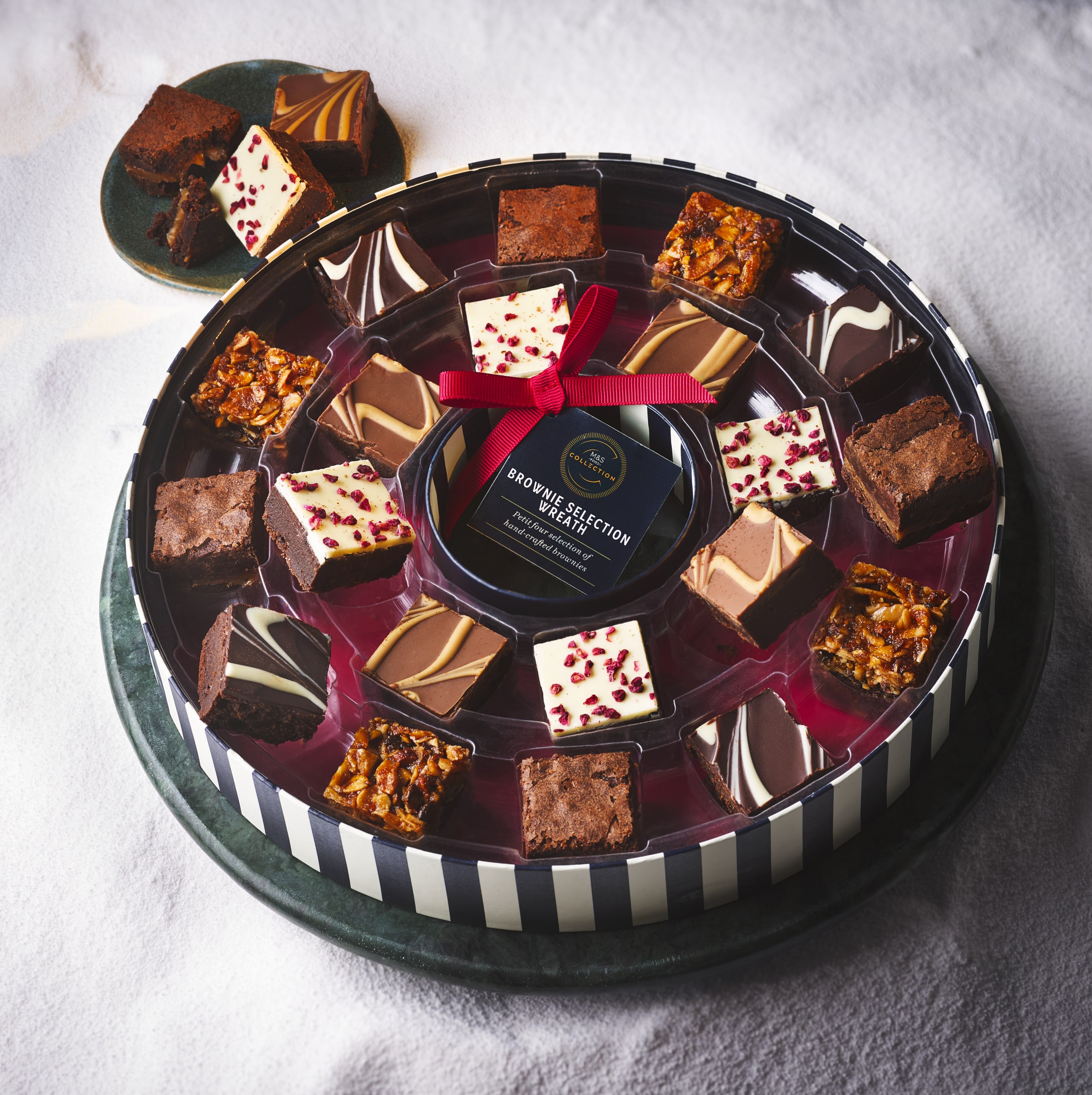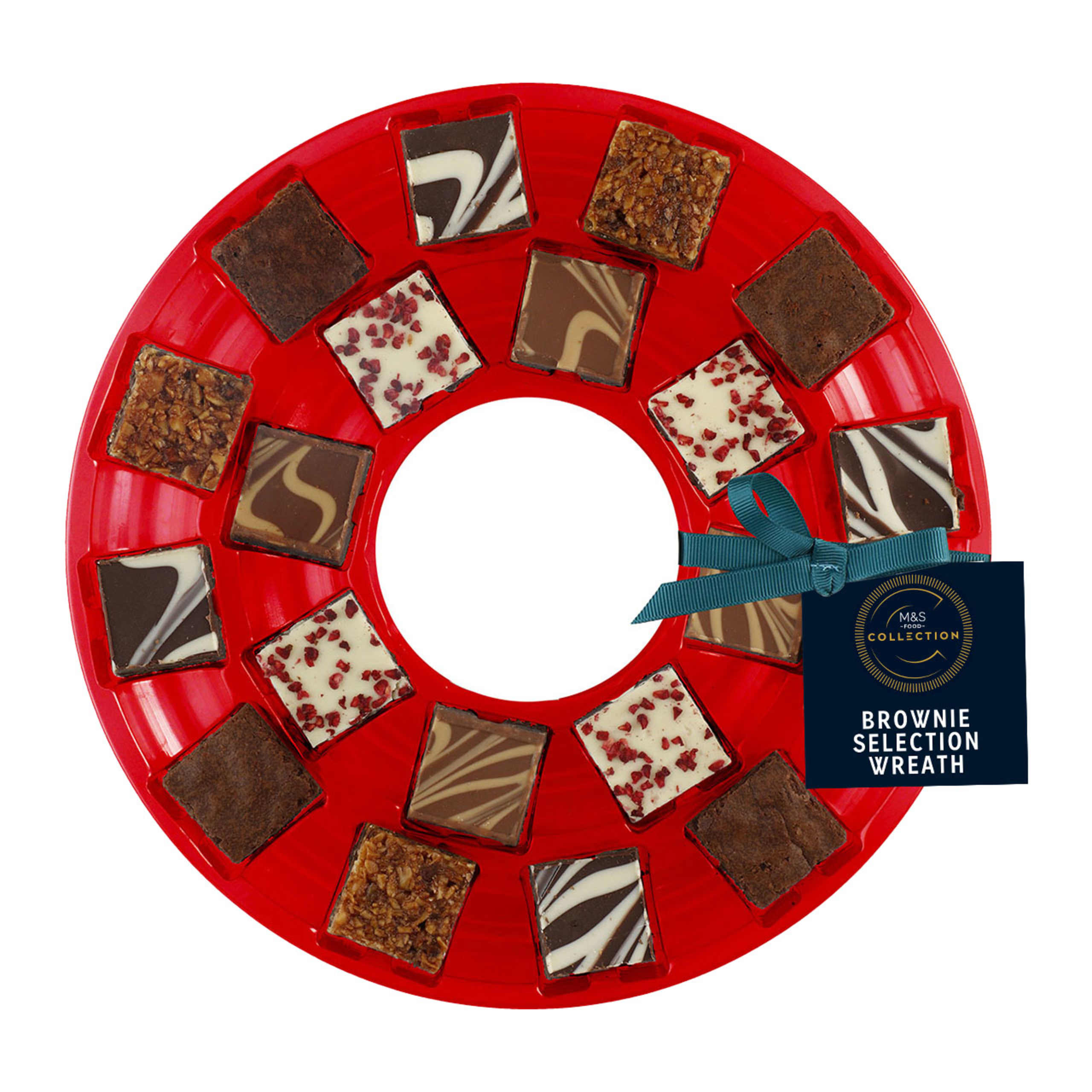 Indulge in our Collection Brownie Selection Wreath, a decadent array of chocolate brownies. Squidgy dark chocolate brownies, enriched with unique toppings like crystallised ginger, salted caramel, and freeze-dried raspberry pieces.