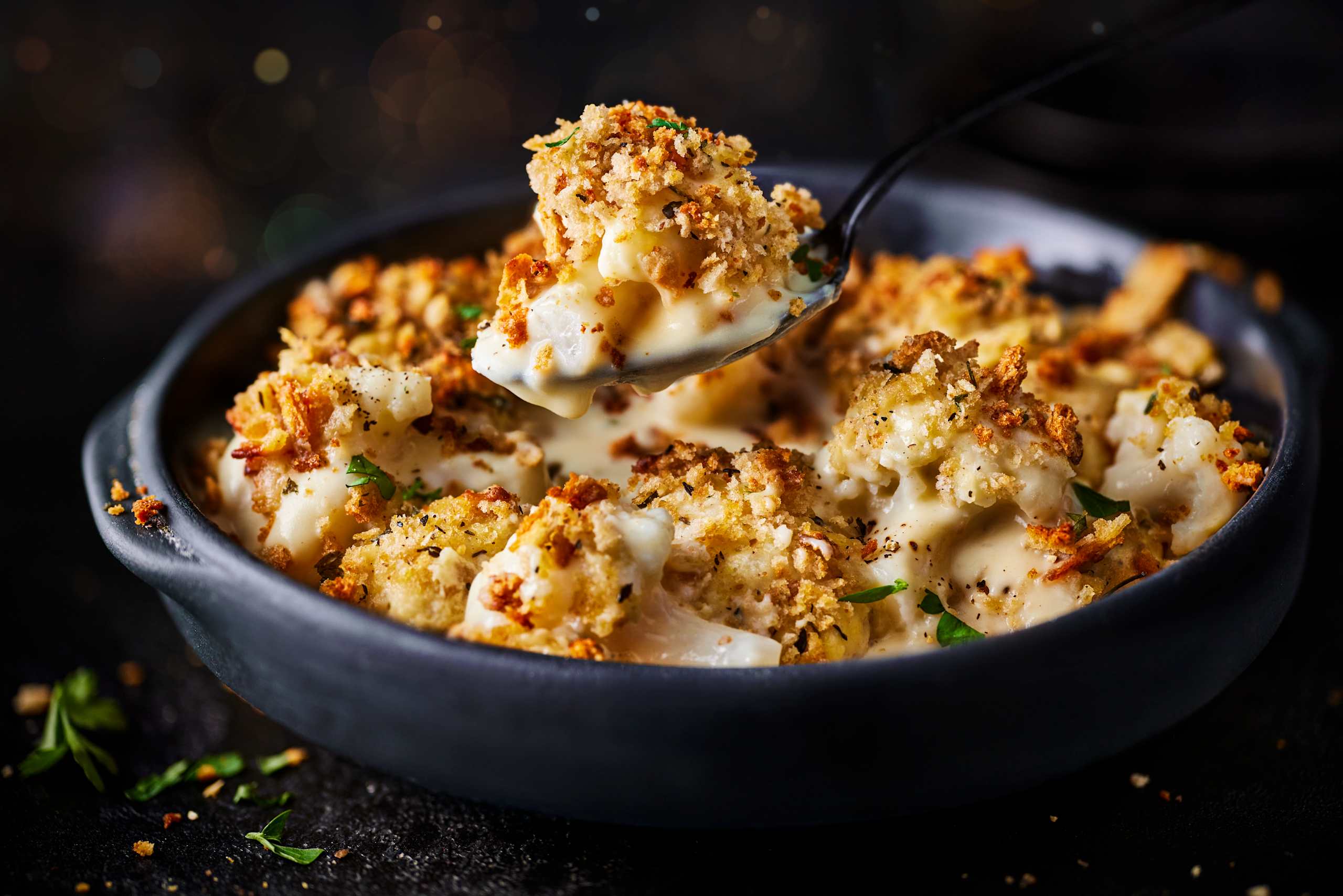 Tender cauliflower florets baked in a rich sauce made with Cornish Cruncher Cheddar cheese, Emmental and mozzarella, finished with a Cheddar and sourdough crumb.