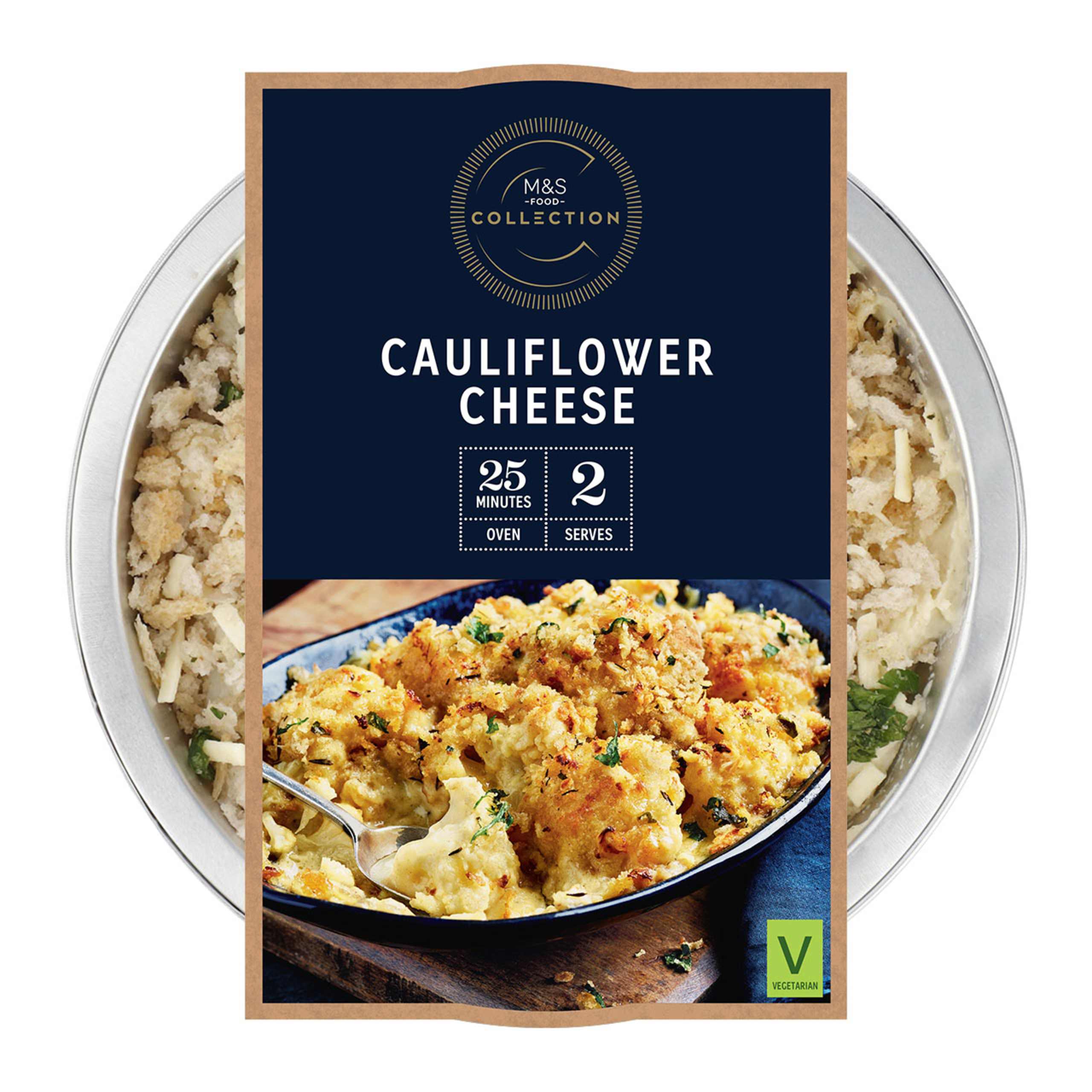 Tender cauliflower florets in a creamy cheese sauce made with Cornish Cruncher cheddar, emmental and mozzarella, are finished with a golden, crunchy topping of savoury breadcrumbs with cheddar cheese and a sprinkling of parsley.