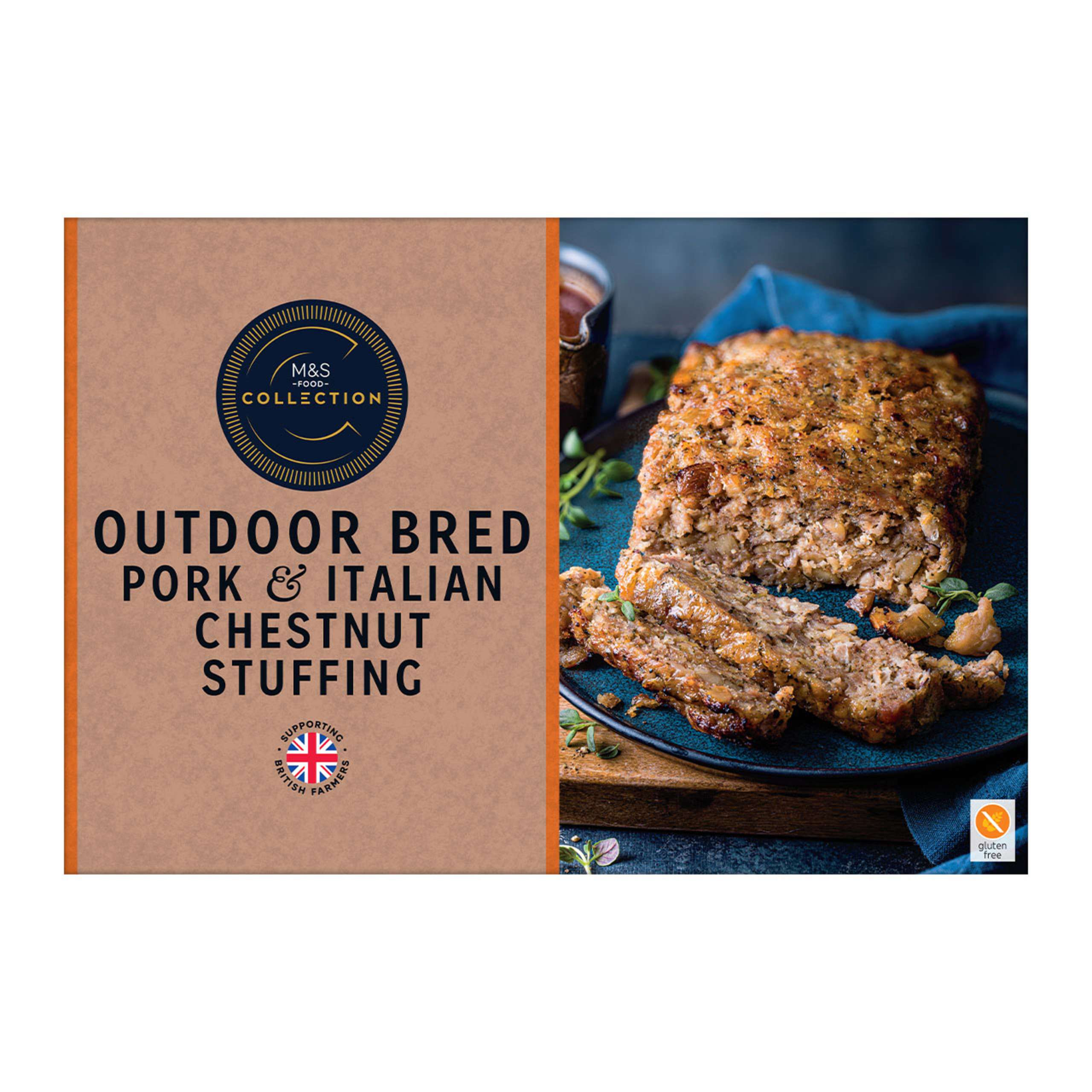 With succulent British outdoor-bred pork, enriched with earthy chestnuts and aromatic thyme and smoked bacon.