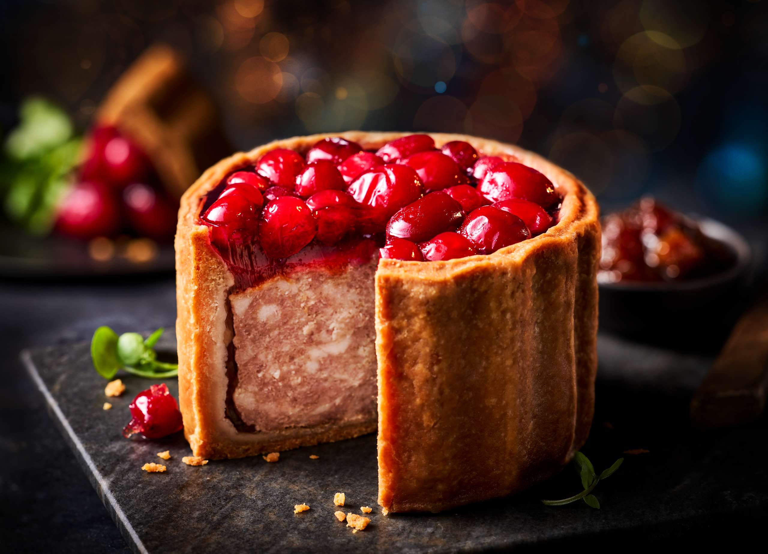 This beautiful hand-finished pie will be the star of your festive buffet table. It’s made with British outdoor-bred pork from our trusted M&S Select Farms, a cranberry and port jelly, encased in a crisp, hot-water crust pastry and topped with sweetened cranberries.