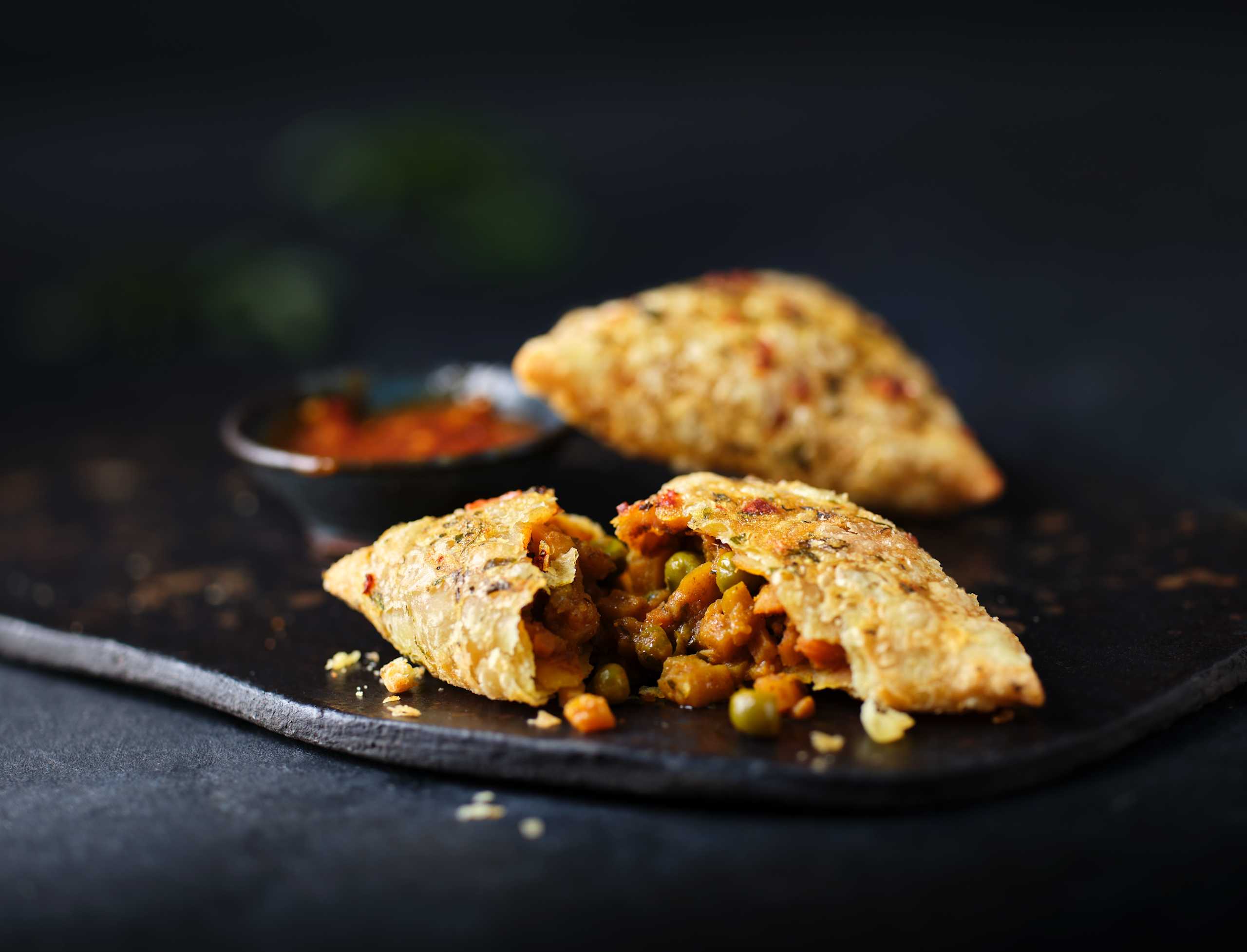 These mouthwatering Collection Crispy Jewelled Vegetable Samosas burst with an aromatic mix of spiced potatoes, butternut squash, peas and carrots, hand-wrapped in a crispy, golden pastry. Coriander, sweet red chillies and fenugreek leaves add a fragrant finishing touch.