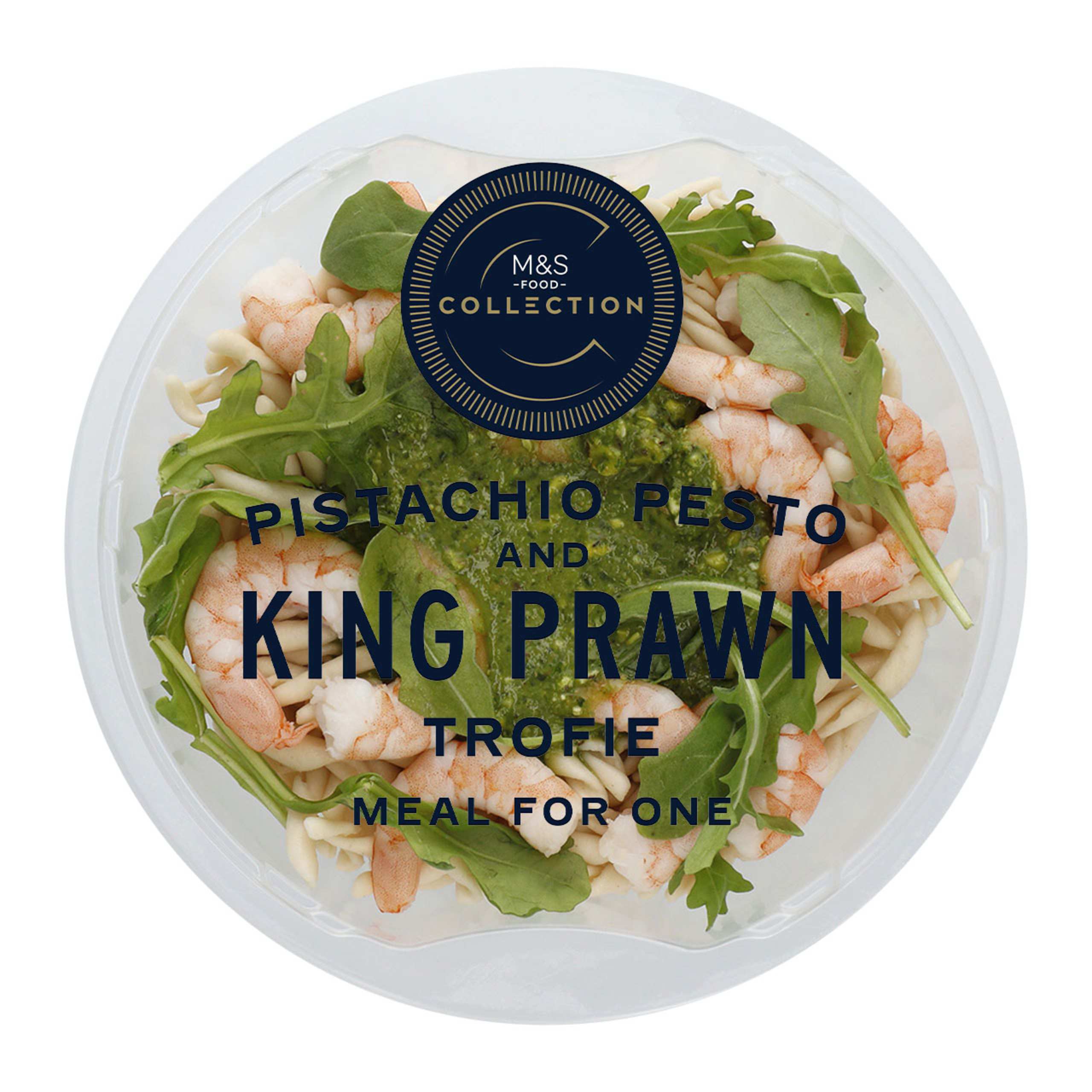 Our Collection Pistachio Pesto and King Prawn Trofie combines tender, sweet, responsibly sourced Honduran king prawns with individually rolled bronze die-cut trofie pasta. The aromatic pesto, made with roasted garlic, basil, pistachios and Parmesan, has a deep, nutty flavour, while it's finished with peppery wild rocket.