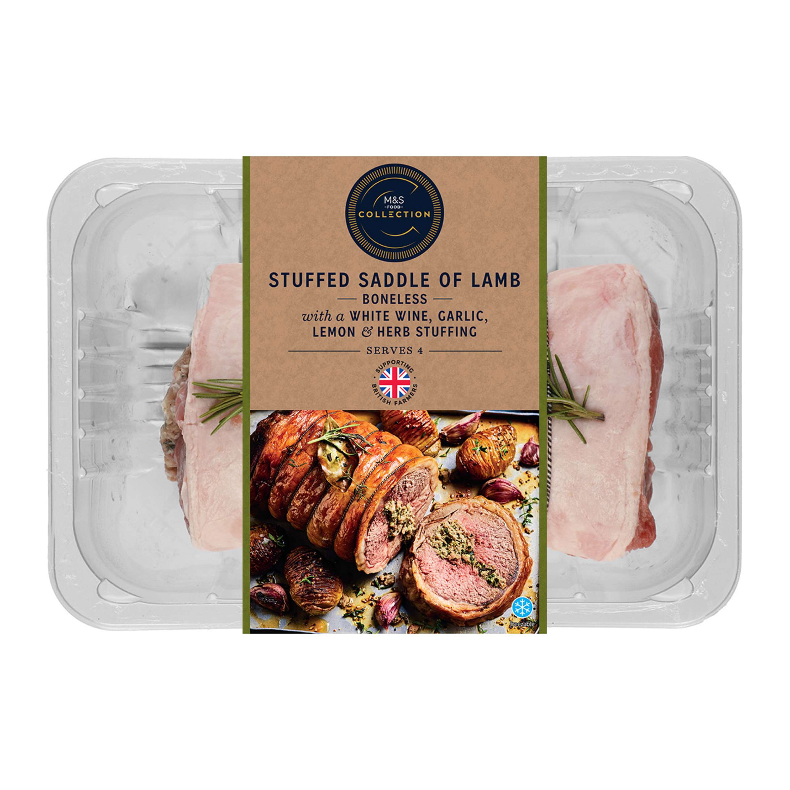Indulge in the Collection Stuffed Saddle of Lamb, a premium, boneless lamb joint filled with a rich white wine, garlic, lemon, and herb stuffing. Perfect for a luxurious roast dinner, this tender cut serves four and delivers exceptional flavour with every bite. Ideal for special occasions or festive feasts. Expertly sourced from M&S select farms we know and trust.