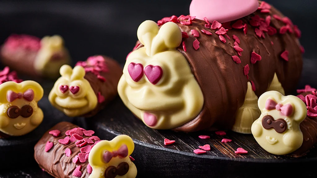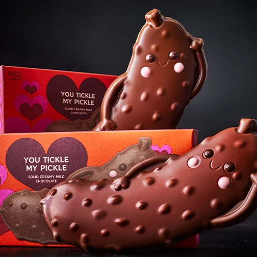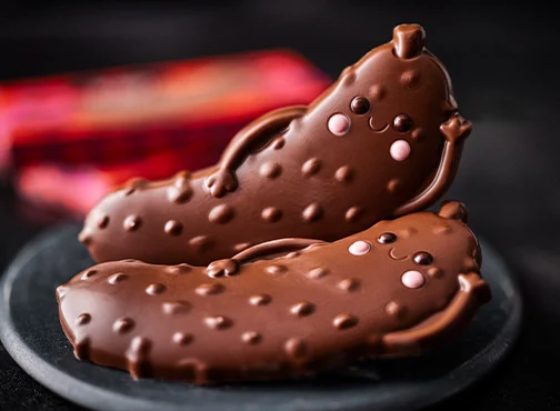 You Tickle My Pickle – A creamy milk chocolate character, finished with pink-tinted white chocolate cheeks and dark chocolate eyes.