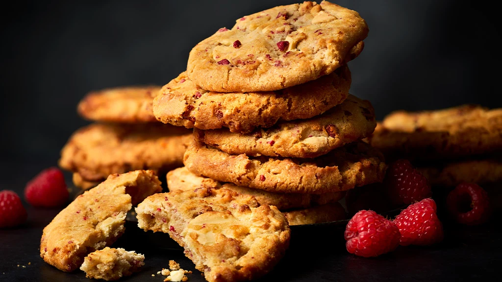 Baked fresh in our in-store bakery, these White Chocolate and Raspberry Cookies are packed with flavour and texture, with oats for a soft, chewy bite. Made with 23% smooth white chocolate and real freeze-dried raspberries for a naturally fruity burst, with no added flavourings. Available in a pack of five—perfect for sharing (or not).