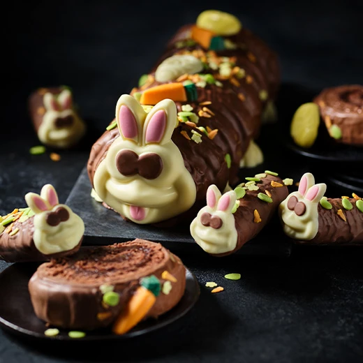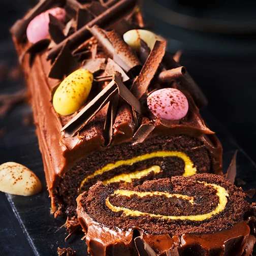 Our Easter Nest Chocolate Roulade, available from 1 April, is a light chocolate sponge rolled in between layers of rich chocolate sauce and white chocolate mousse, decorated with milk and dark chocolate nests and Speckled Eggs.