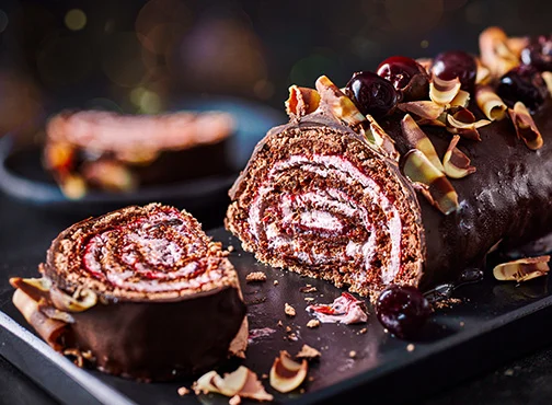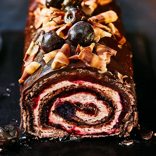Collection Chocolate Cherry Roulade – Hand-rolled chocolate meringue with cherry semi-freddo, chocolate sauce, and whole Amarena cherries, enrobed in Belgian dark chocolate and finished with dark and white chocolate shavings.