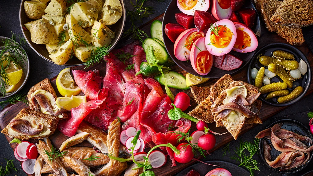 Arrange everything on a board with Sweet Cured Hot Smoked Mackerel, Beetroot, Horseradish and Dill Smoked Salmon, Baby Cucumbers, sliced radishes, lemon wedges and fresh dill.