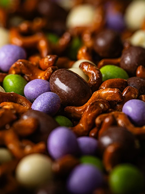 Time to crack out a not-so-scary movie the whole family can enjoy while tucked in on the sofa. Tune into your favourite film (Hocus Pocus, anyone?) and snack on our Hallow-Scream Munch mix, full of jelly beans, crunchy malt balls, salted pretzels and fudgy brownie pieces smothered in creamy white chocolate. Our Spooky Kookie Dough Bites are also a fan favourite, blending creamy chocolate with a soft brownie and biscuit crumb centre and candy-coated chocolate nibs.