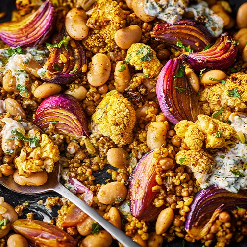 A Middle Eastern-inspired roasted cauliflower and butter bean traybake – pack for lunch or serve with grilled fish or chicken for dinner.