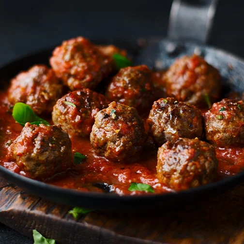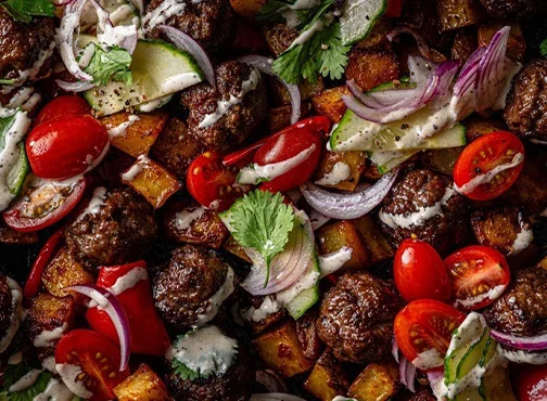Try the meatballs in an easy traybake: Toss with chunks of potatoes and strips of sweet red pepper, then roast until golden and sizzling. Finish with a tahini drizzle and a fresh tomato salad for a hearty, one-tray dinner.