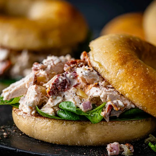 Piri piri chicken sandwich filler, made by shredding our Piri Piri Chicken Slices and tossing with 2 tbsp yogurt and ½ tbsp mayonnaise. Load into bagels or sandwiches.