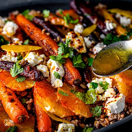 Harissa-roasted root vegetables, made by roasting baby carrots (or use this roots for roasting mix to skip the chopping) until tender, then tossing with 1 tsp Rose Harissa and 1 tsp honey. Use in salads or blitz into soup.