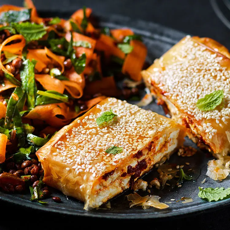 This feta filo parcel is dripping in harissa and honey, transforming the everyday ingredient into something very special. Serve alongside a tangy carrot, date, and lentil salad. Ready in less than half an hour, this savoury bake is perfect for when you want to impress but are short on time.