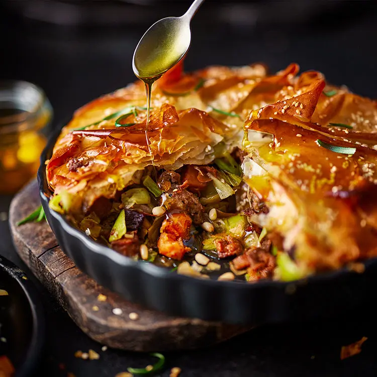 Moroccan-inspired spices pair perfectly with lamb sausages, buttery leeks and sweet potatoes in this hearty lamb filo pie recipe. Using lamb sausages in the filling adds extra flavour. It’s loaded into ready-made filo pastry with sweet leeks and roasted sweet potatoes, then wrapped in filo pastry and baked until gorgeously golden and finished with sesame seeds and a drizzle of honey. Serve as a centrepiece at your next get-together, as an alternative to roast lamb for Easter, or for a Mother’s Day feast.