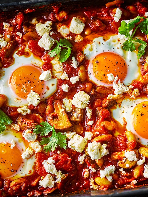 Shakshuka – eggs poached in a spiced tomato sauce with crumbled feta.